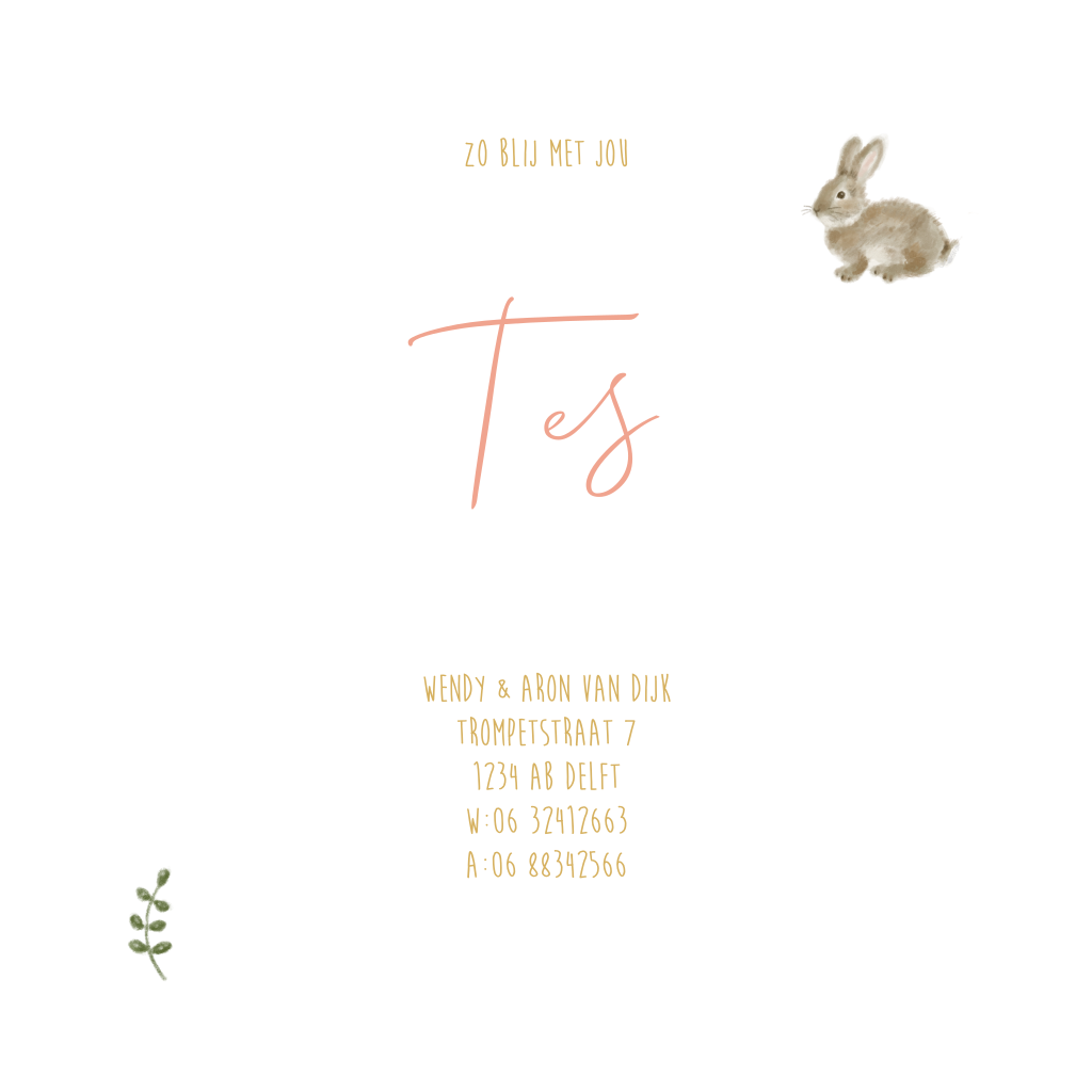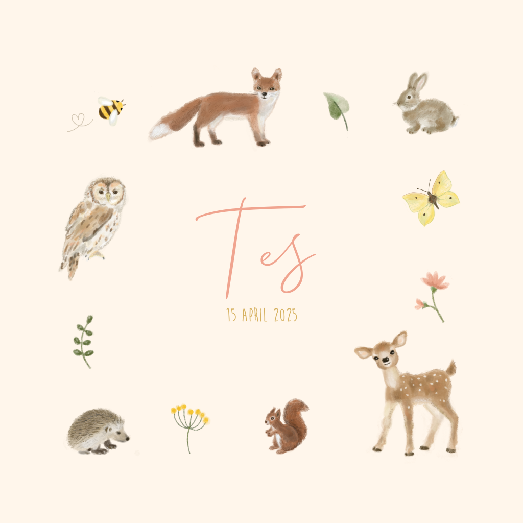 een hip geboortekaartje voor een meisje met bosdieren en planten in lente en zomer sfeer. (4203)