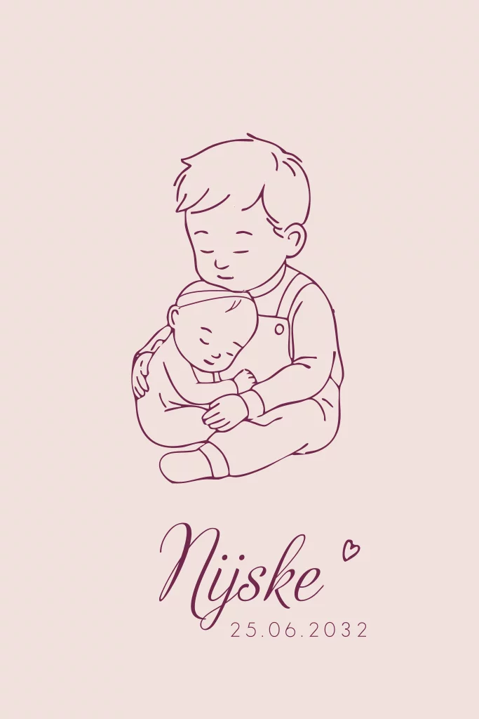 Geboortekaartje meisje met broertje en zusje knuffelen lijntekening