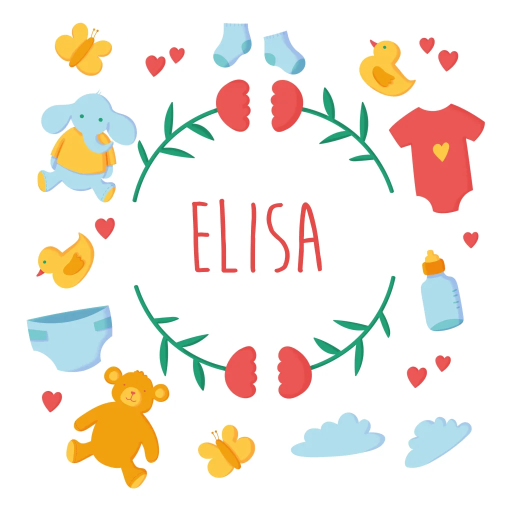 Geboortekaartje voor een meisje met krans en verschillende soorten speelgoed en baby decoratie. (3291)