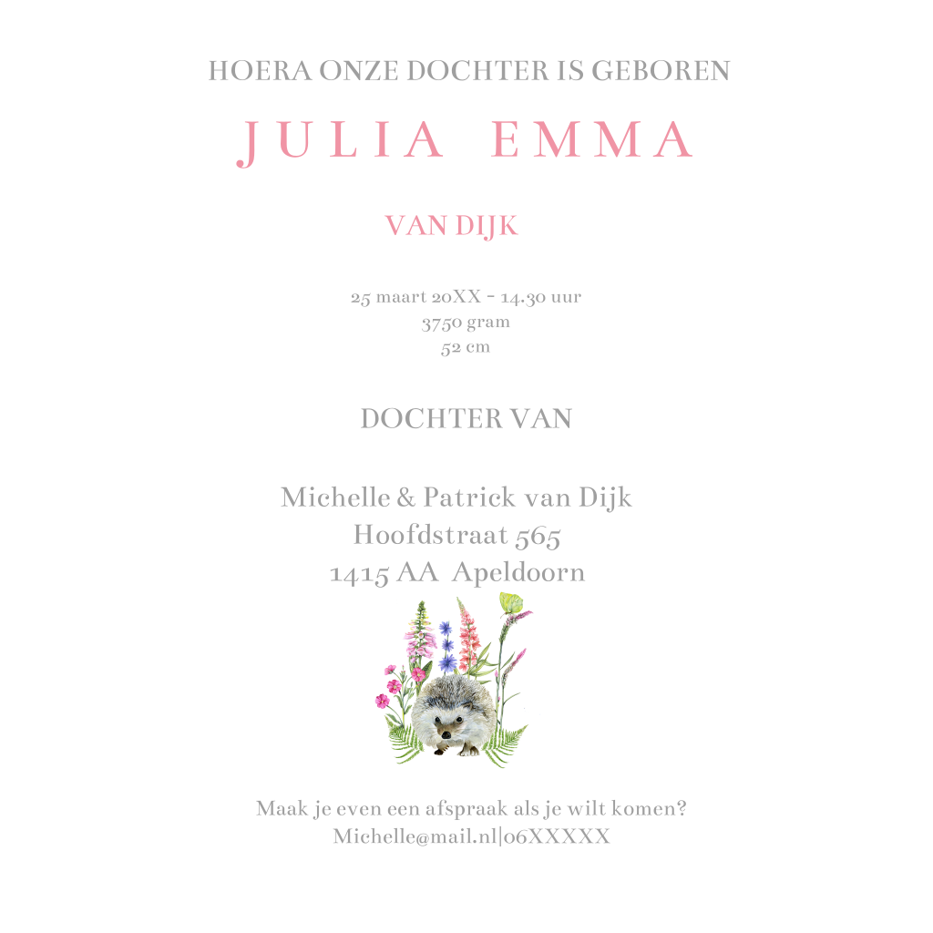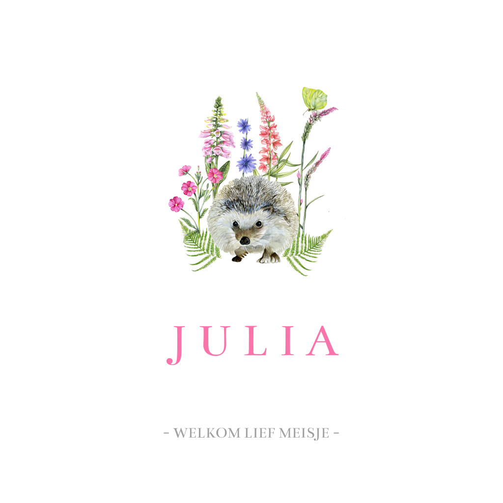 Lief geboortekaartje voor een meisje met een egel