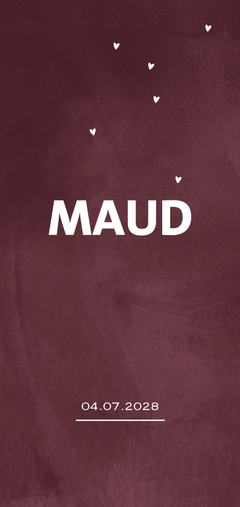 Modern en hip geboortekaartje Maud voor een meisje met velvet look achtergrond en foliedruk hartjes. (4346)