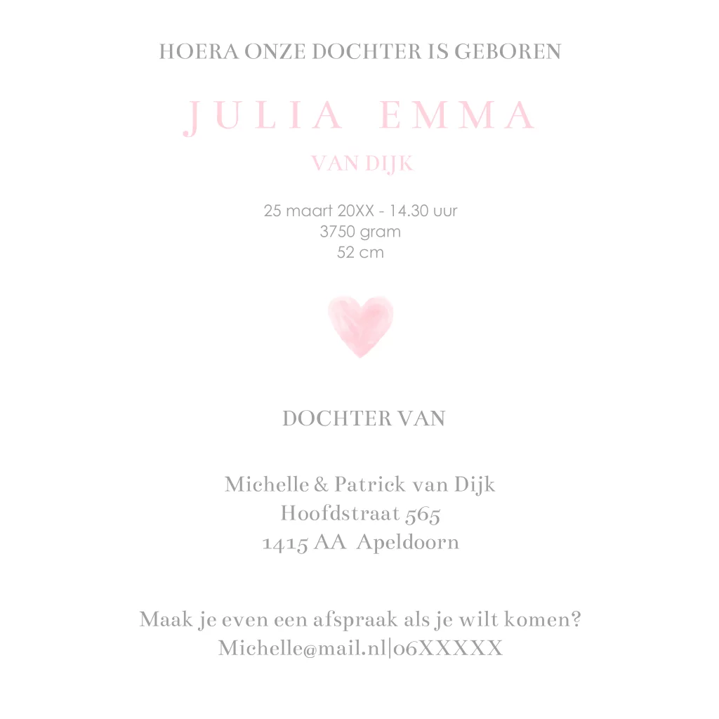 Geboortekaartje hartje van aquarel in het zacht roze voor een meisje. (3424)