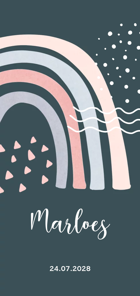 Hip geboortekaartje meisje met foliedruk en abstracte regenboog.