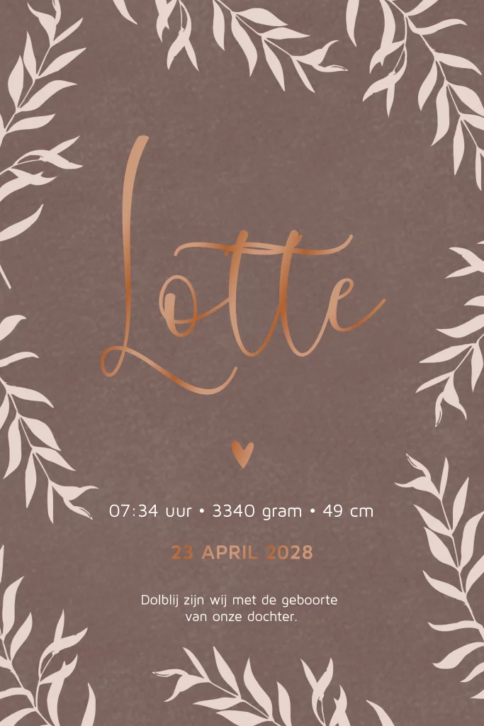 Hip geboortekaartje voor een meisje met takjes op een warm bruine achtergrond en foliedruk.