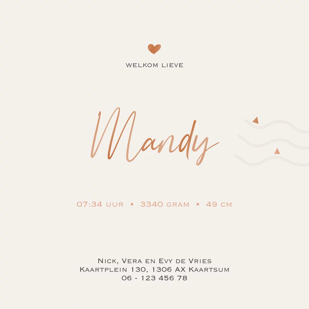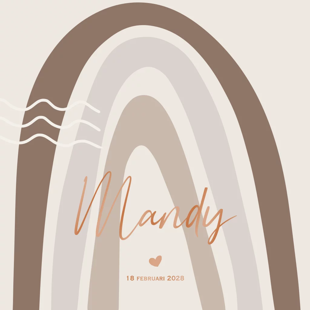 Hip geboortekaartje meisje met regenboog in aardetinten en foliedruk.
