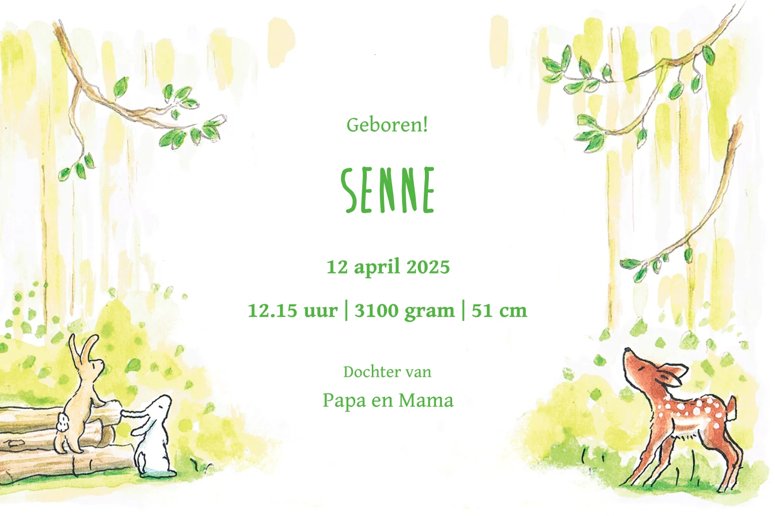 Geboortekaartje jongen of meisje met getekende hertjes in het bos