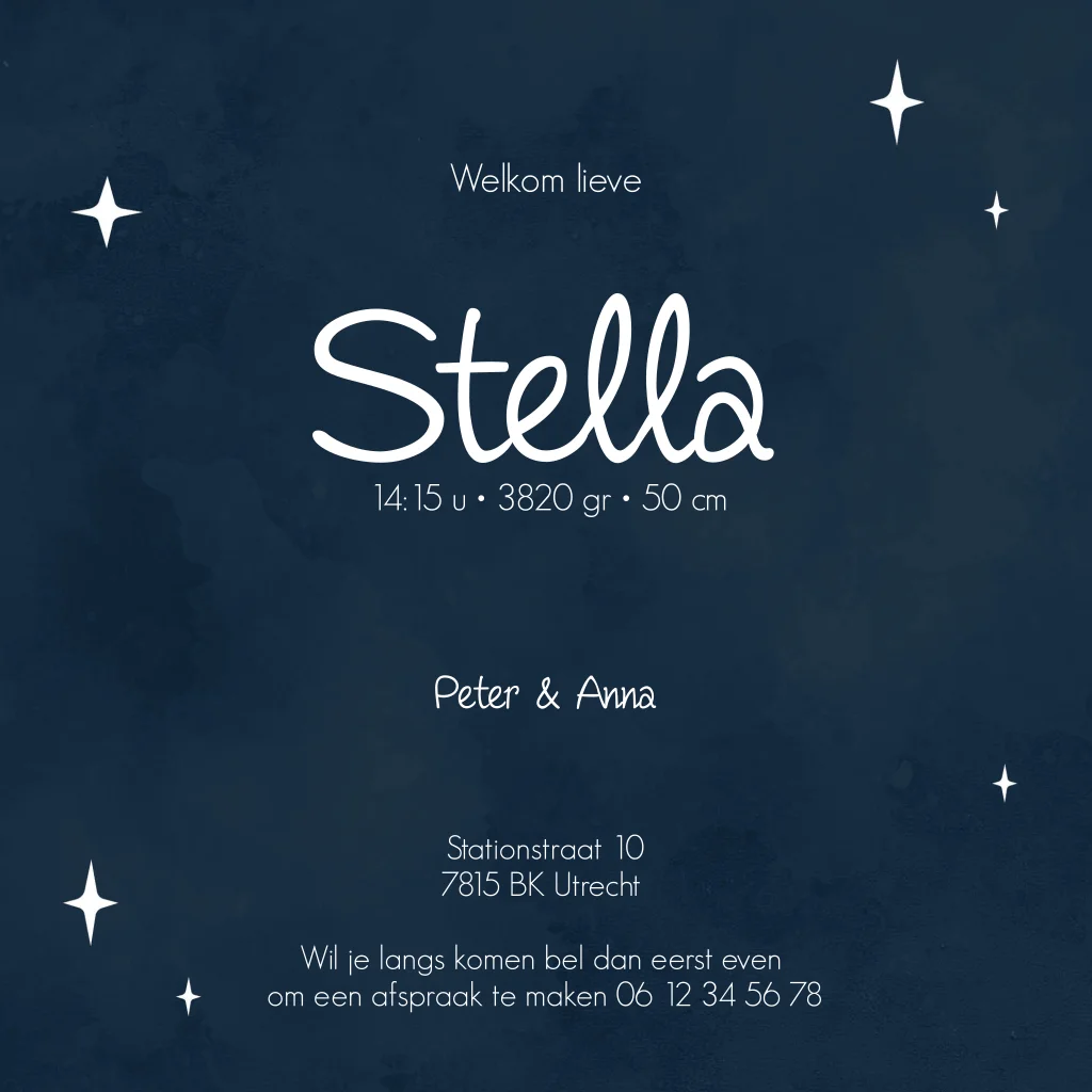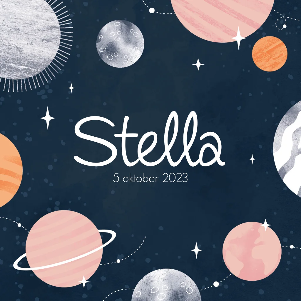 Geboortekaartje voor een meisje, met ruimte thema. Planeten en sterren in het roze, oranje en wit op een donker blauwe achtergrond. (3260)