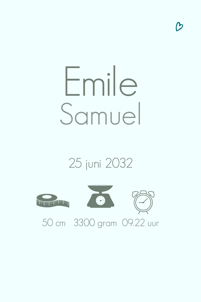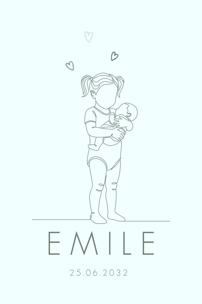 Een lief geboortekaartje met een subtiele lijnillustratie van een trotse zus en haar kleine broertje. Pas het ontwerp eenvoudig aan in onze online editor.