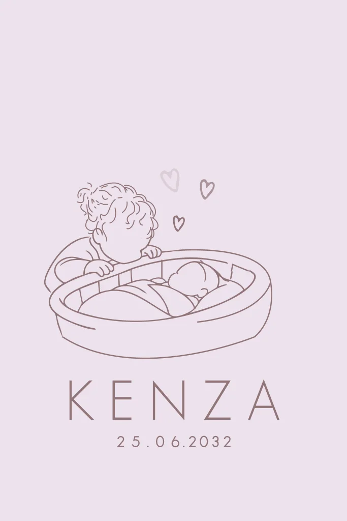 Een warm en teder geboortekaartje voor een meisje, met een minimalistische lijntekening van een grote zus met krullen die nieuwsgierig over het wiegje kijkt naar haar kleine zusje. Het ontwerp heeft een zachte, liefdevolle uitstraling. Pas het ontwerp eenvoudig aan naar eigen wens in onze online editor.