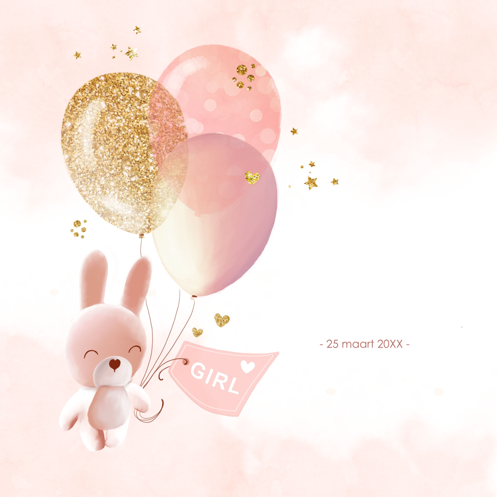 Geboortekaartje Olivia meisje met konijntje hangend aan ballonnen in de lucht. (4630)