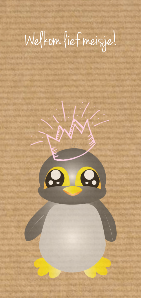 Geboortekaartje langwerpig meisje pinguin met kroon