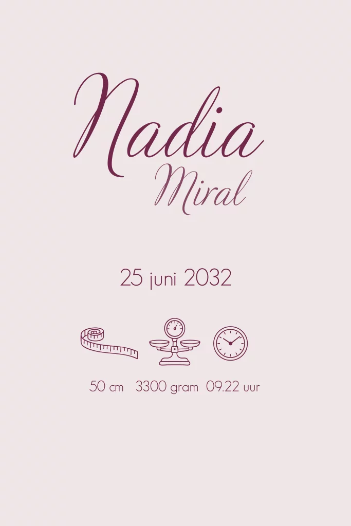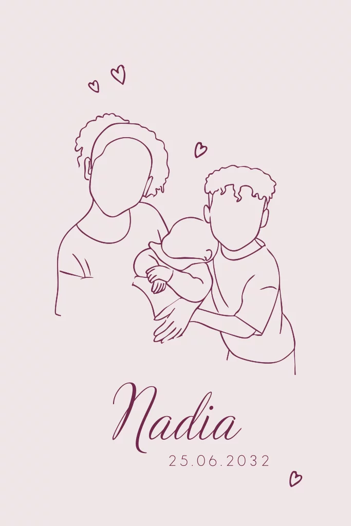 Lief geboortekaartje met familie en roze harten. Pas het ontwerp naar wens aan in onze editor.