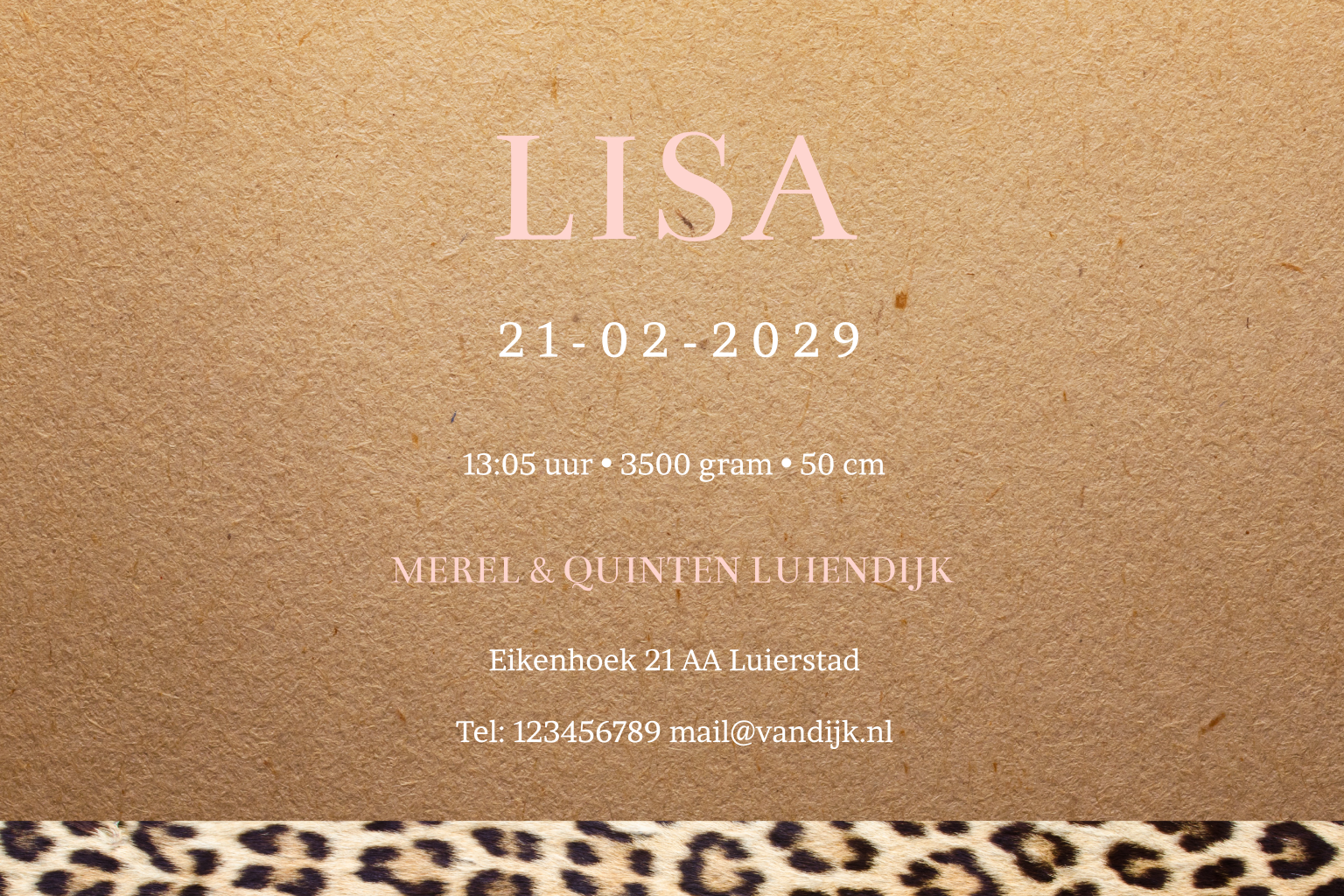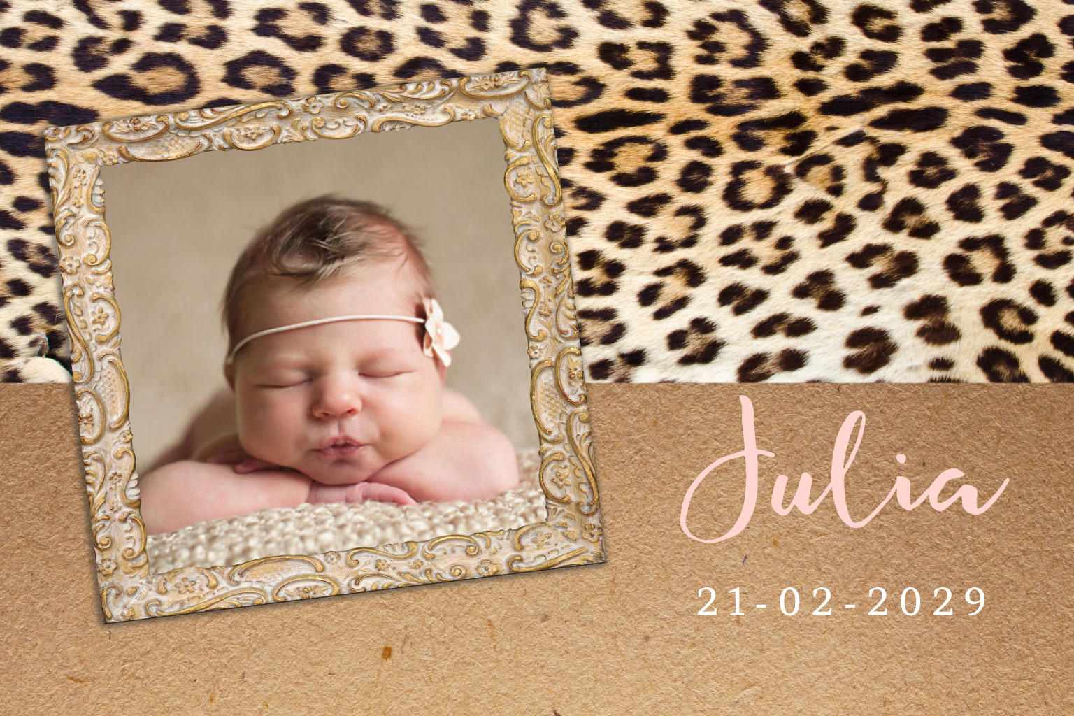 Hip geboortekaartje voor jullie meisje. Met luipaardprint en kraftpapier elementen. (3180)