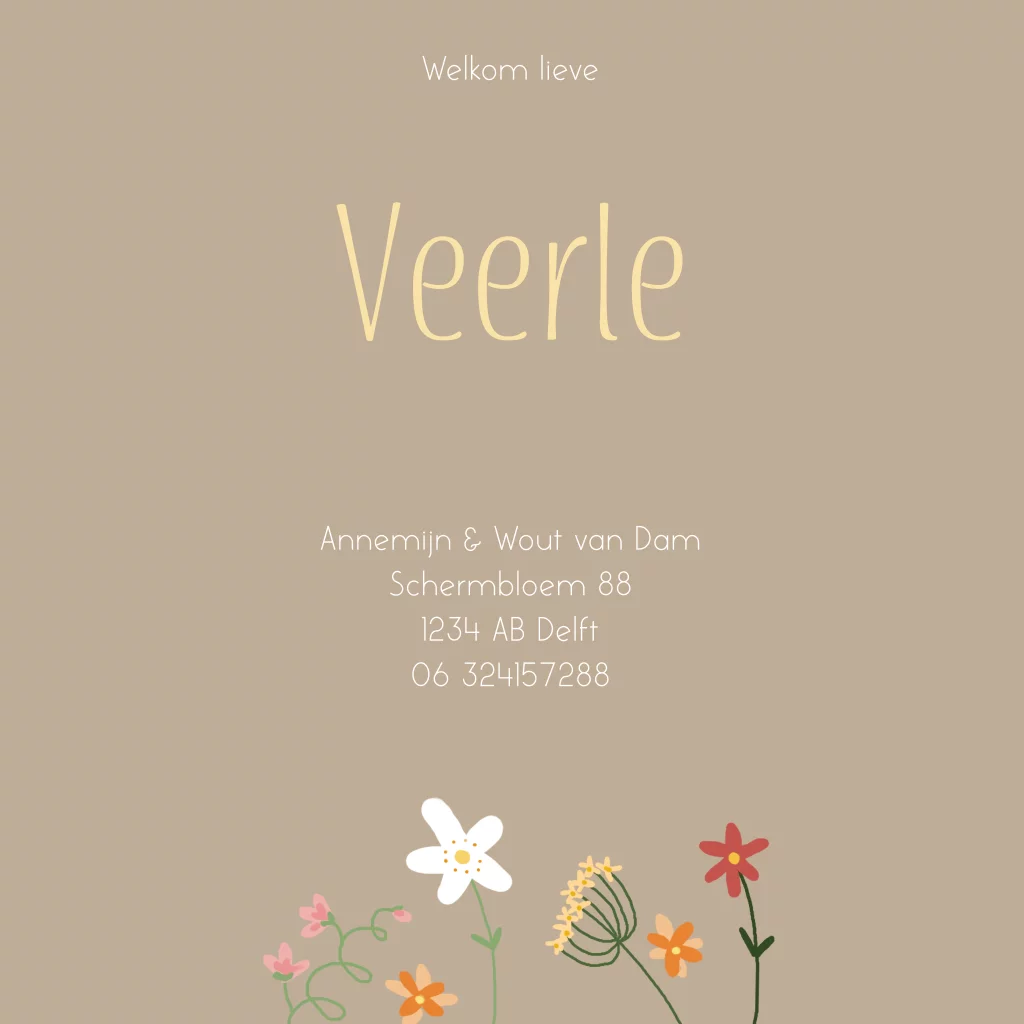 Een modern en fris bloemen geboortekaartje voor een meisje. In de kleuren, rood, geel, wit, oranje en roze