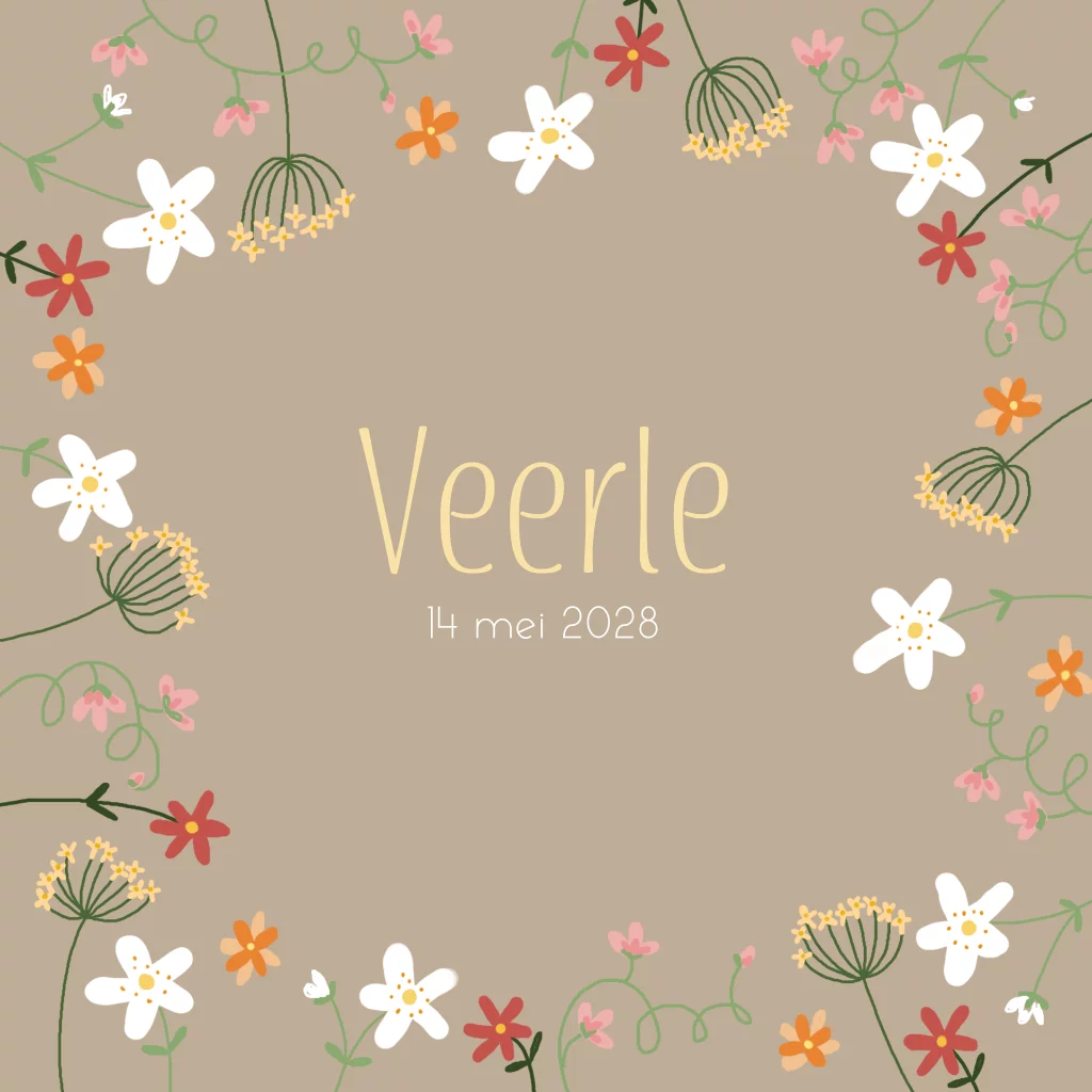 Een modern en fris bloemen geboortekaartje voor een meisje. In de kleuren, rood, geel, wit, oranje en roze