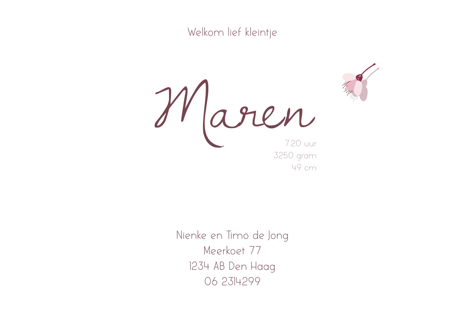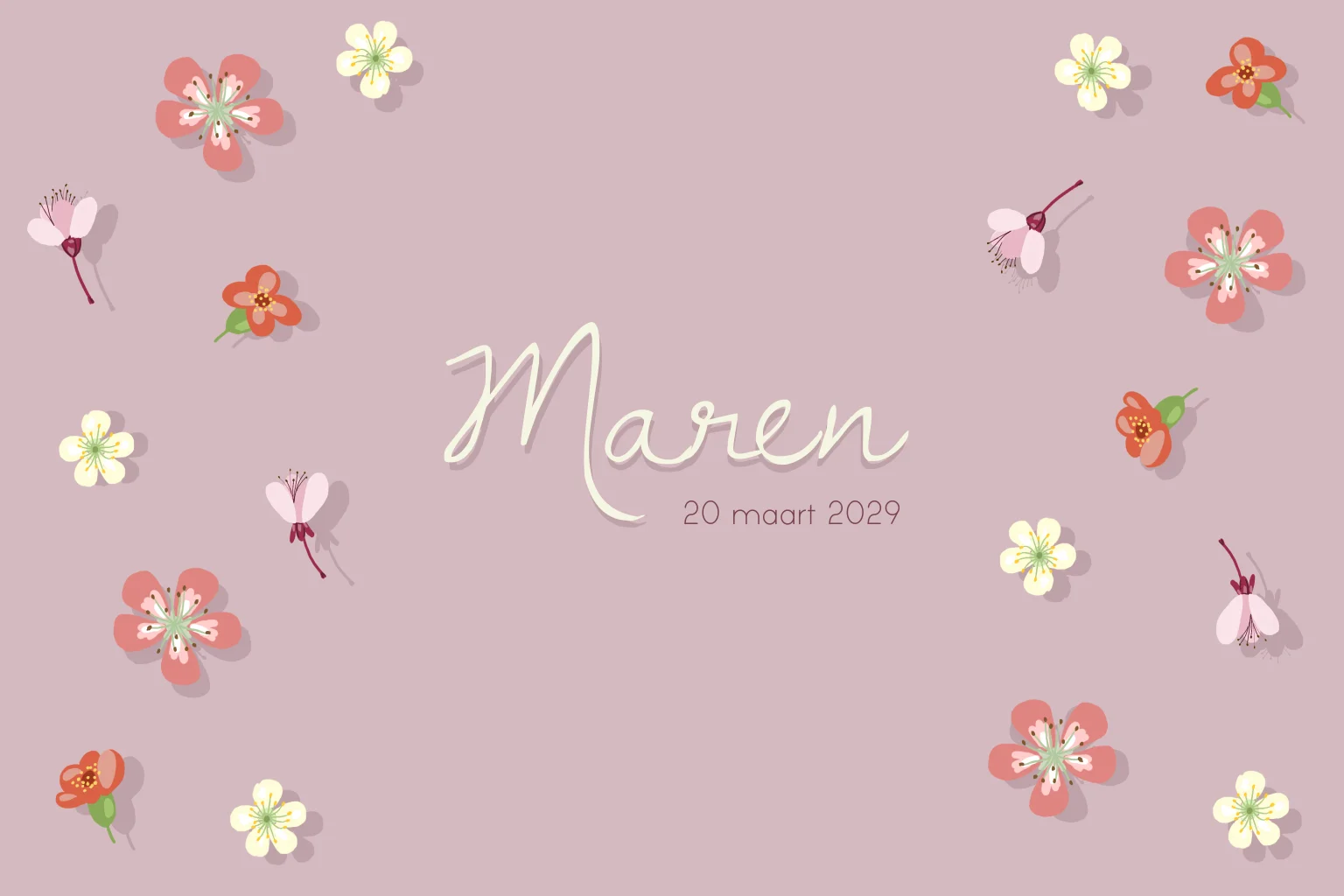 Een zacht en kleurrijk geboortekaartje voor een meisje met vrolijke roze, witte en rode bloemen. Het speelse bloemmotief geeft een vrolijke, uitnodigende uitstraling. Pas het ontwerp eenvoudig aan in onze online editor.