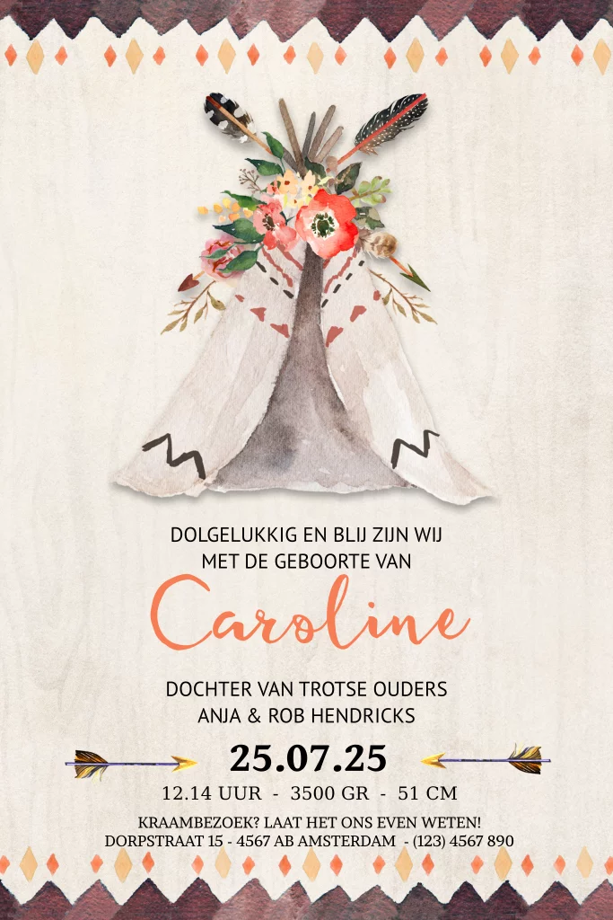 Geboortekaartje meisje bohemian licht hout met wigwam