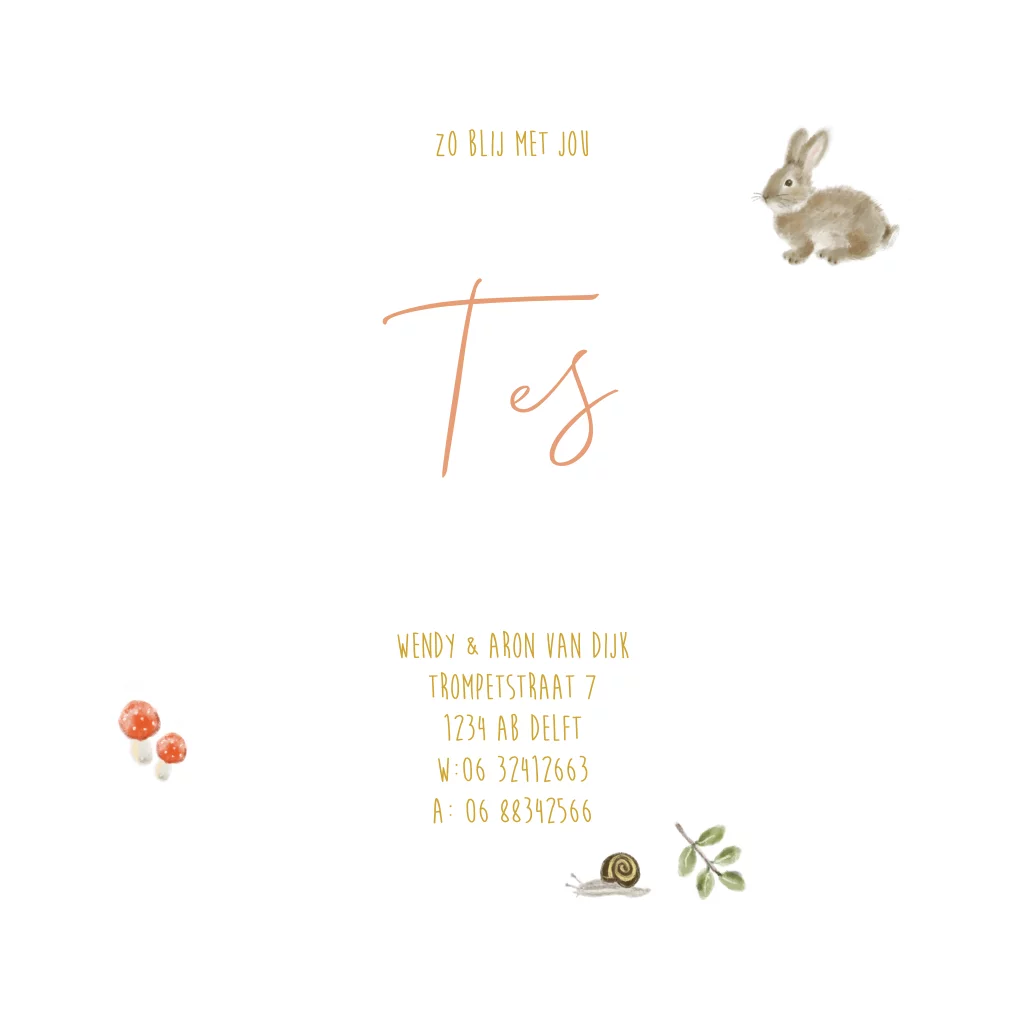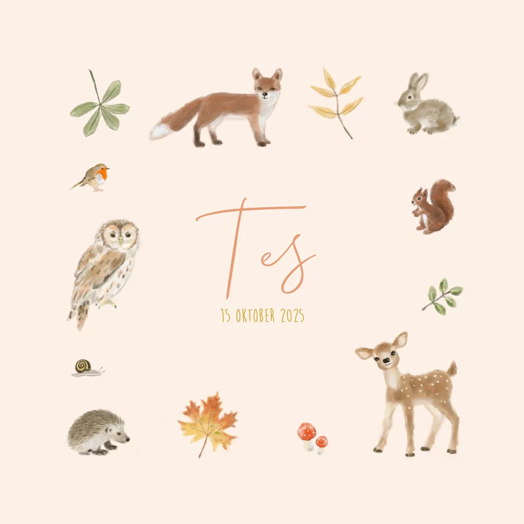 Een hip geboortekaartje met bosdieren en bladeren voor een meisje. Mooi geschilderd in warme kleuren. (4134)