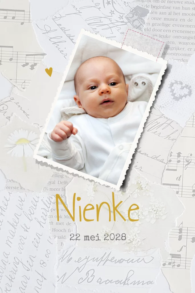 Een hip geboortekaartje voor een meisje, met een achtergrond met een collage van stukjes tekst, bloemen en muziek. Met ruimte voor een eigen foto. (3648)