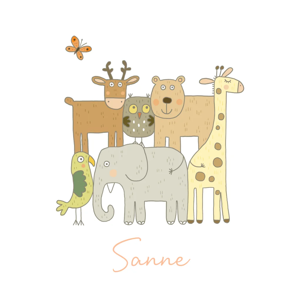 Een hip geboortekaartje voor een meisje met een vrolijke beestenboel. Je ziet een vlinder, hert, uil, beer, giraf, papegaai en olifant. (4350)