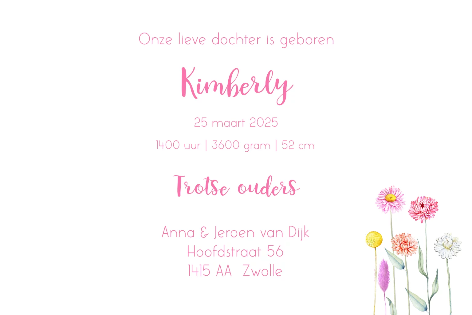 Hip en lief geboortekaartje meisje met droogbloemen
