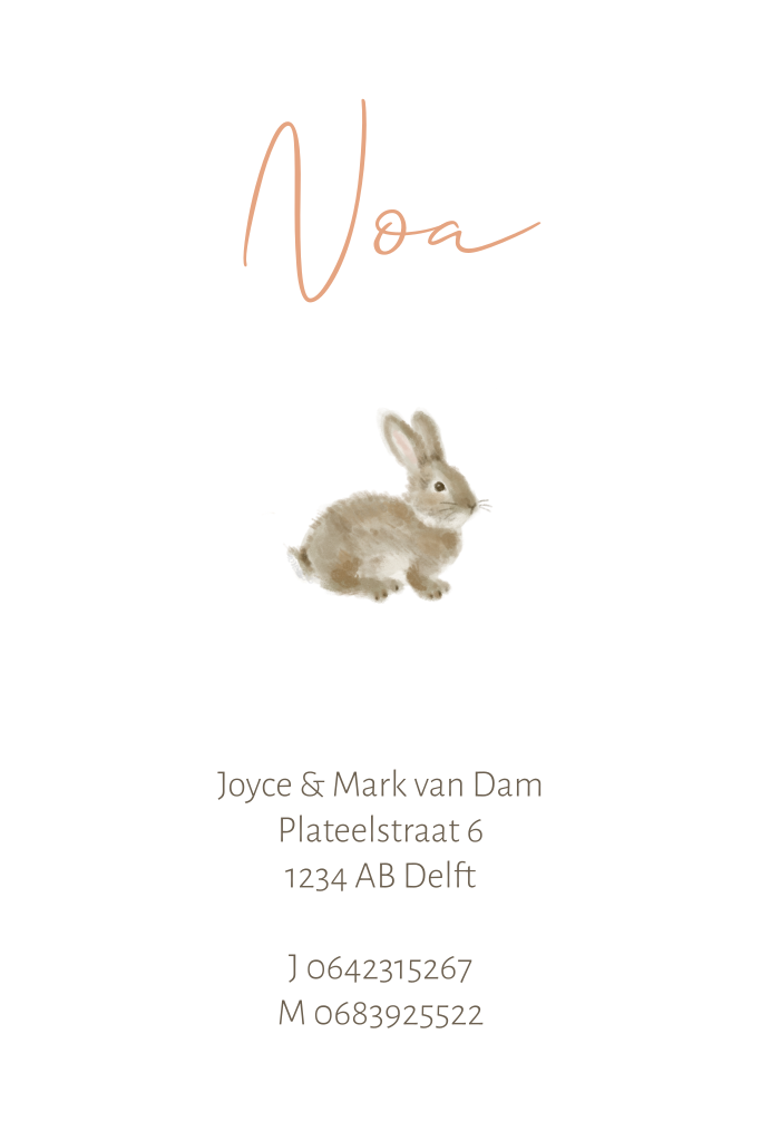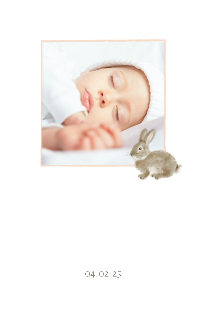 Een origineel geboortekaartje voor een meisje met een schattig konijntje en ruimte voor een eigen foto. De naam is gedrukt in rosefolie. (4172)