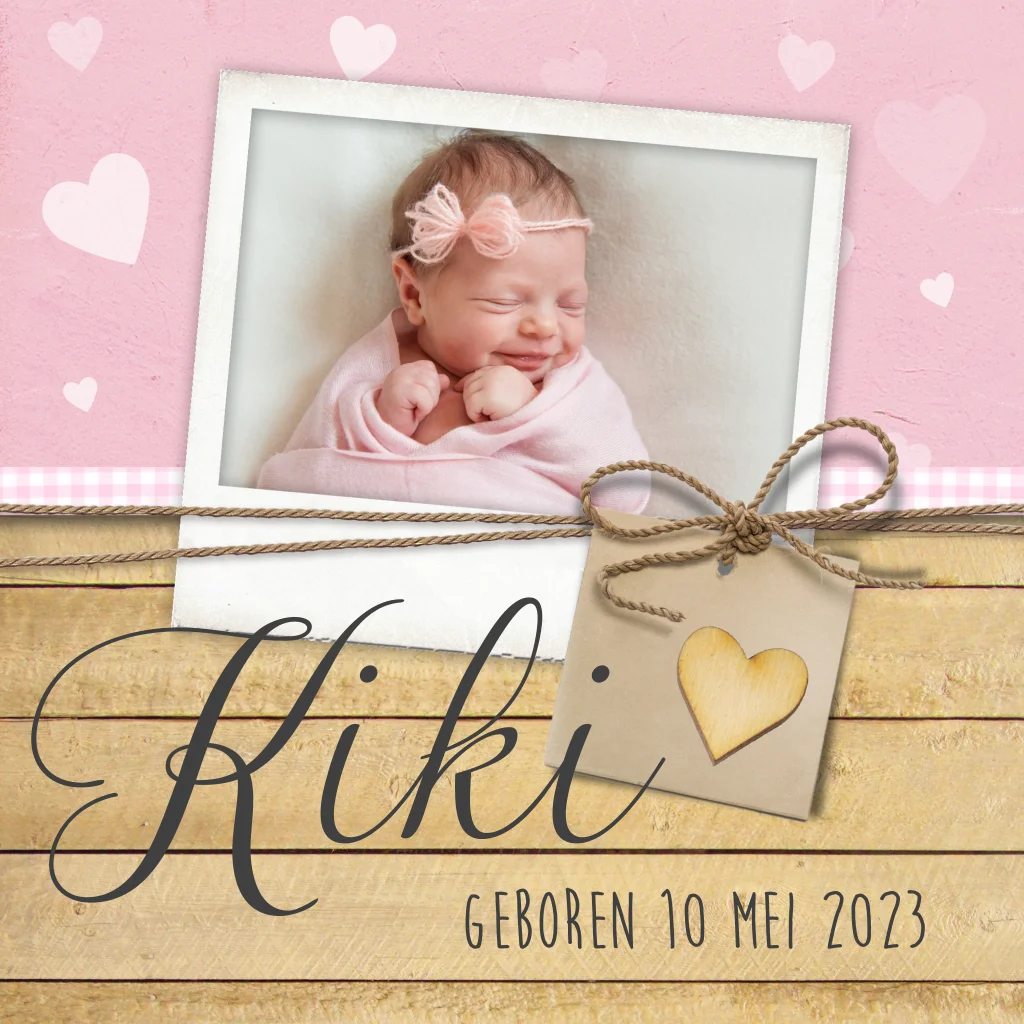 Stoere geboortekaartje meisje met foto label en houten hartje