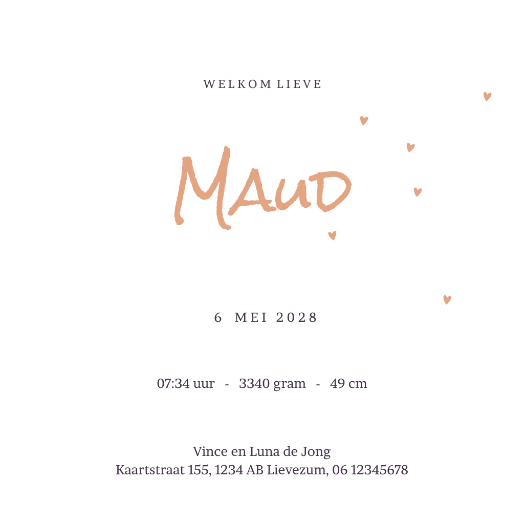 Geboortekaartje meisje met gansje en foliedruk hartjes. (4234)