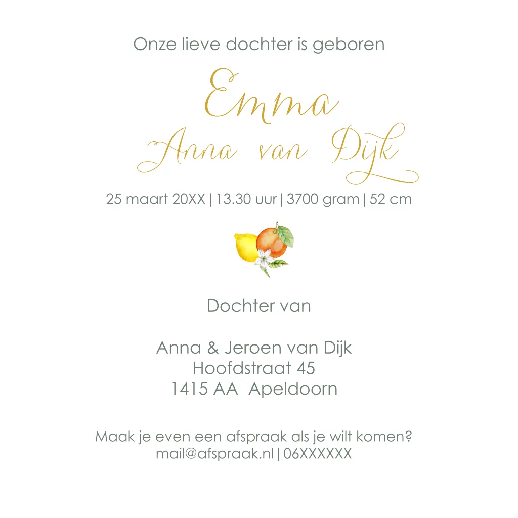 Geboortekaartje meisje met hartje van citroen en sinaasappels