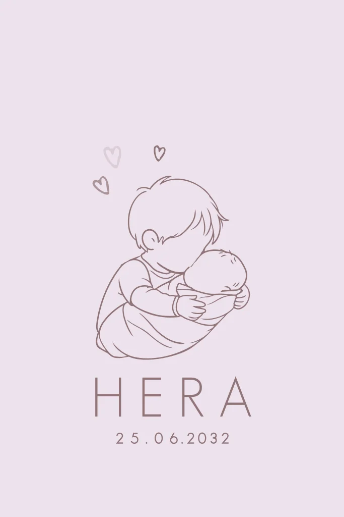 Een liefdevol geboortekaartje voor een meisje, met een subtiele lijntekening waarop haar grote broer haar vasthoudt, knuffelt en een kusje geeft. Het ontwerp straalt warmte en geborgenheid uit. Pas het ontwerp eenvoudig aan naar eigen wens in onze online editor.