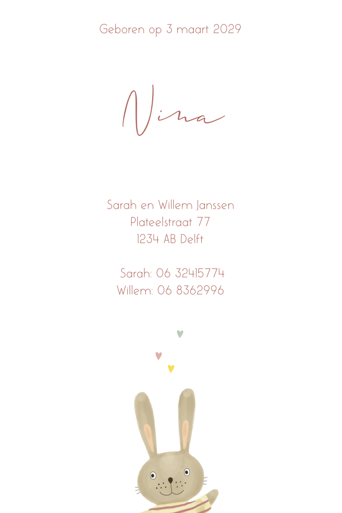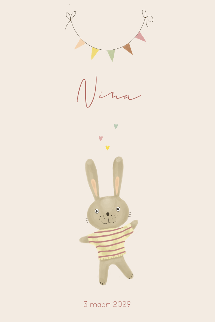 Een lief geboortekaartje voor een meisje in zachte kleuren met een konijn, een slinger en hartjes. (4696)