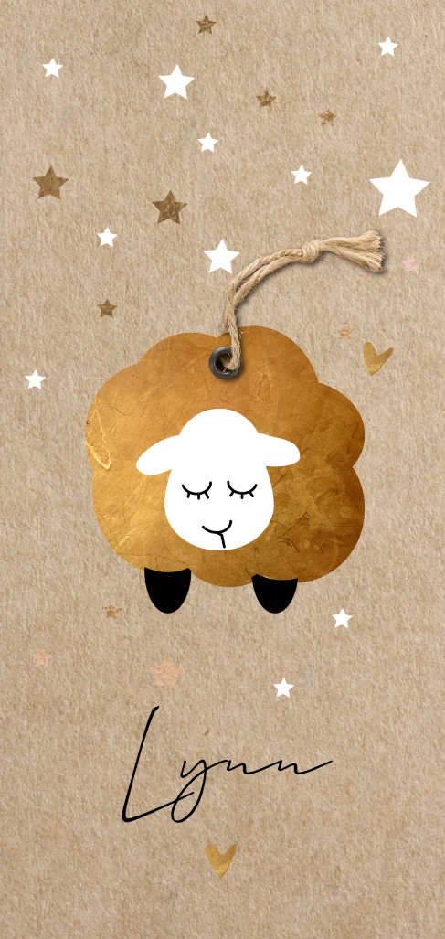 Geboorte kaartje meisje met kraft kleurige achtergrond een schaapje en sterretjes.