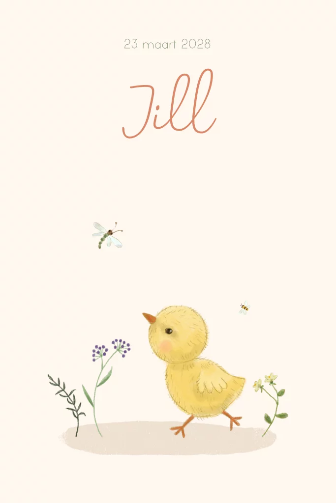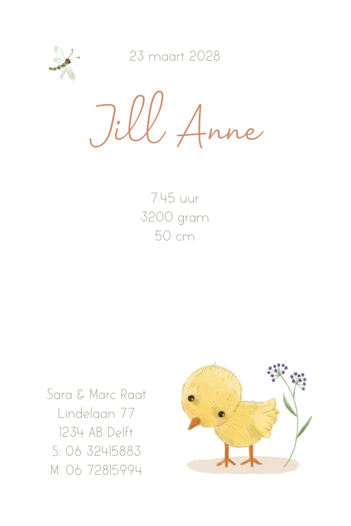 Geboortekaartje meisje lente kuiken libelle vlinnder bloemen