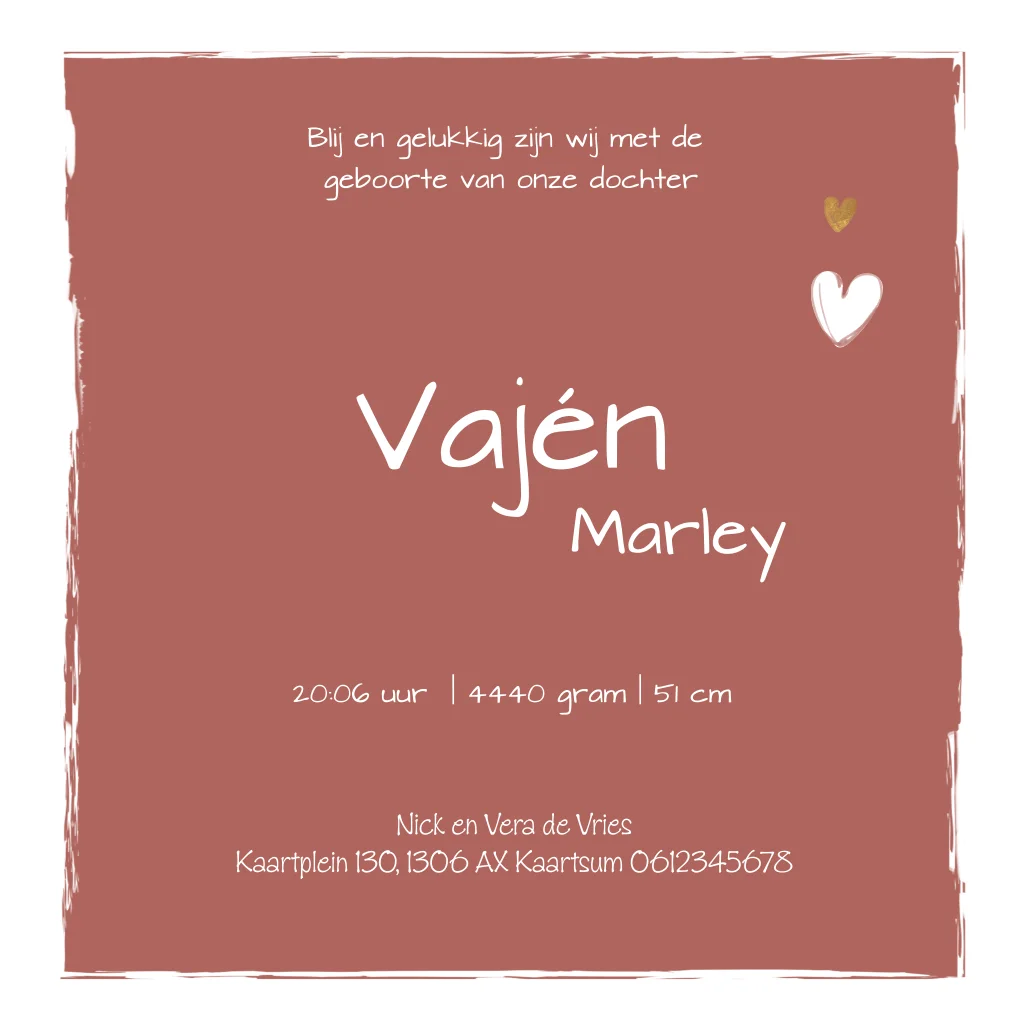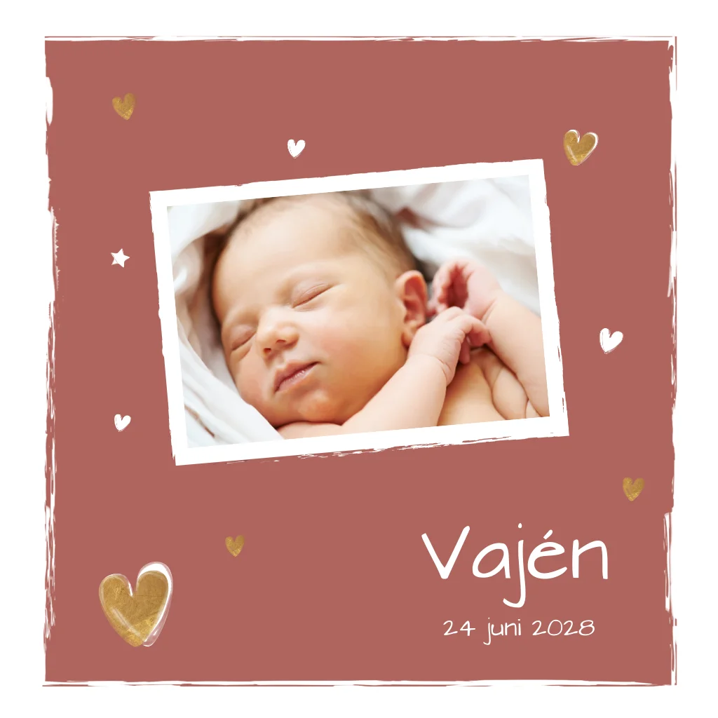 Geboorte kaart meisje met terra kleur. Ruimte voor eigen foto en hartjes.