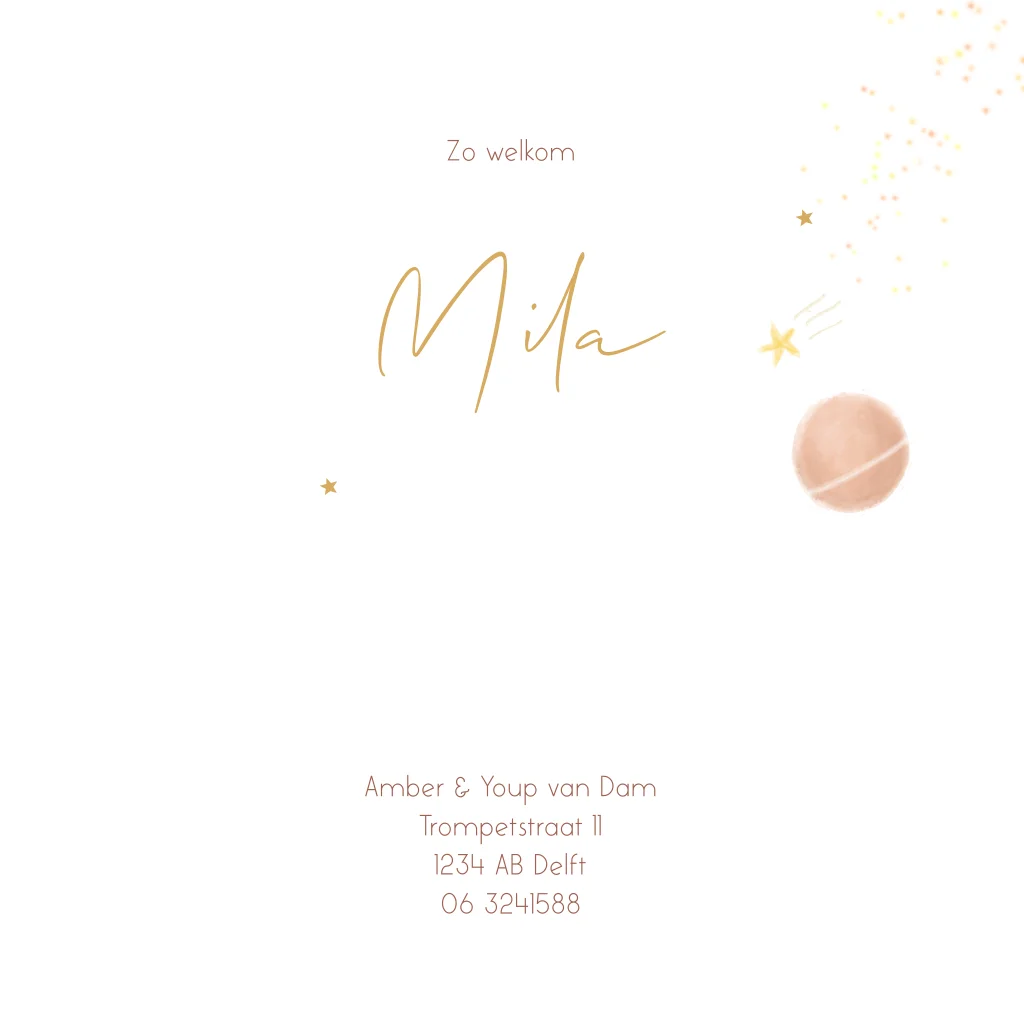 Een hip geboortekaartje in heelal thema voor een meisje met maan, sterren en planeten. De naam en de kleine sterren zijn gedrukt in goudfolie. (4633)