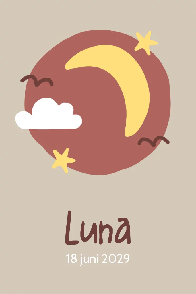 Een fris en modern geboortekaartje voor een meisje met maan wolken sterren en meeuwen