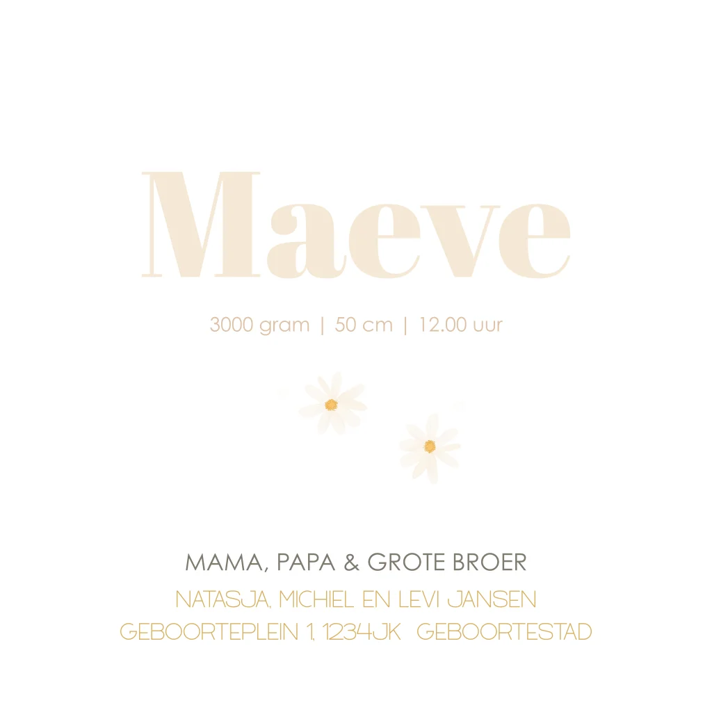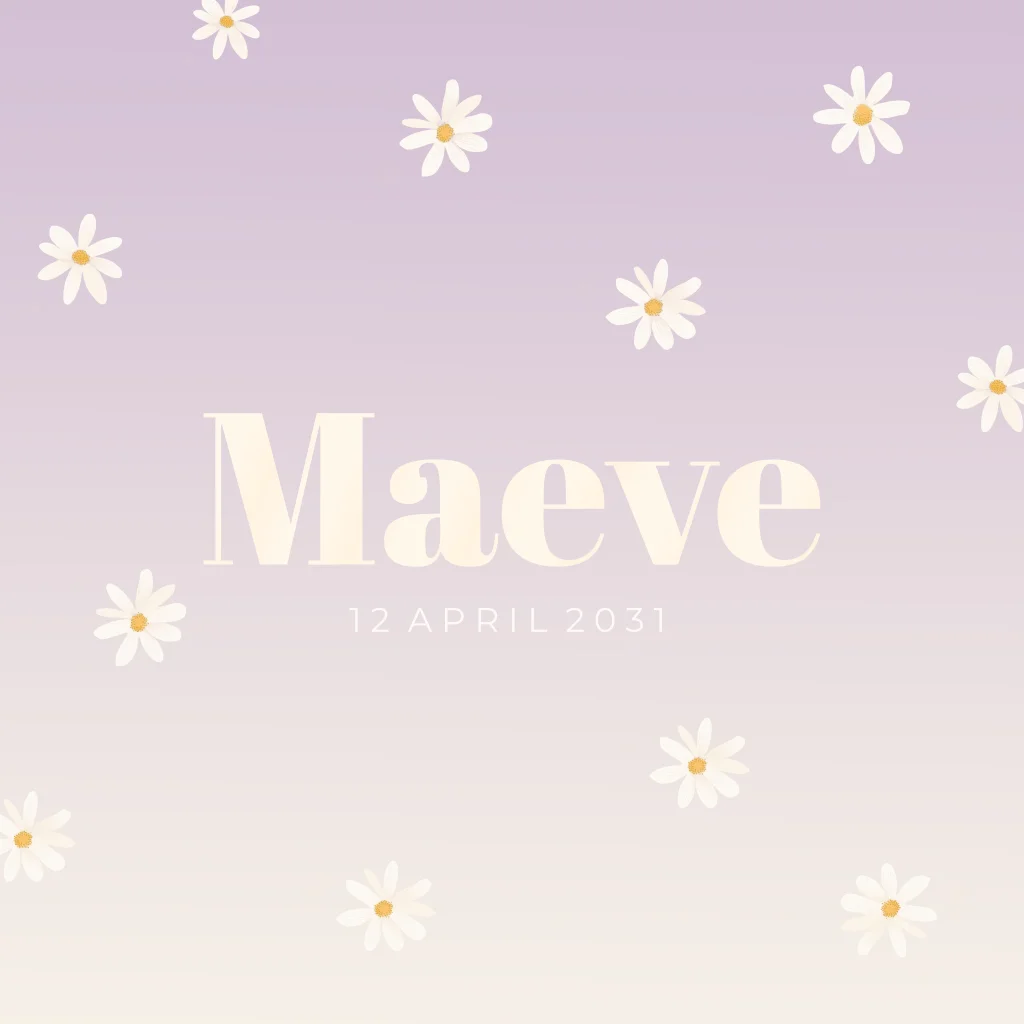 Een lief en vrolijk geboortekaartje voor een meisje met een hippe lila achtergrond en speelse madeliefjes die een zachte, bloemige uitstraling geven. Pas het ontwerp eenvoudig aan in onze online editor.