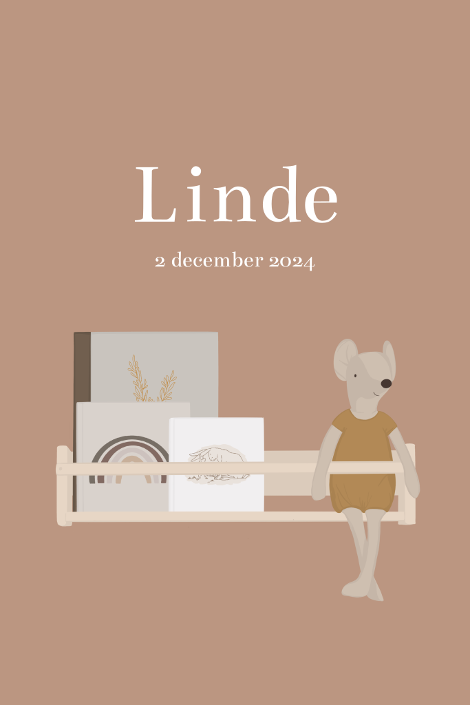 Geboortekaartje meisje met plank kinderkamer met boeken en knuffel van een muis. (4149)