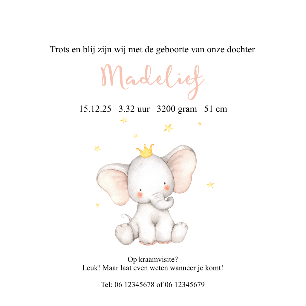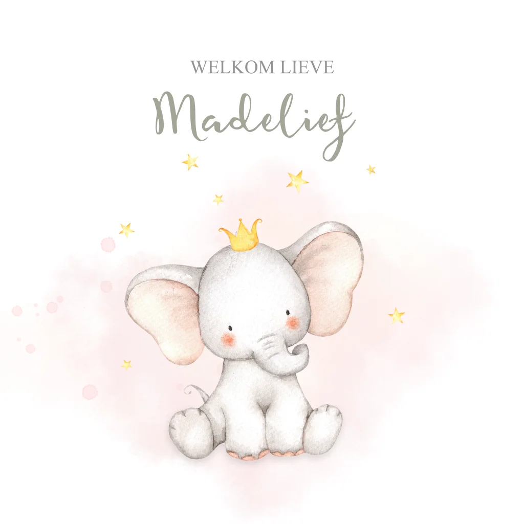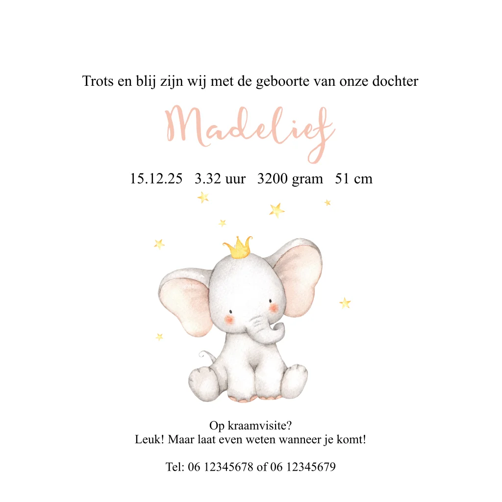 Geboortekaartje meisje met olifant en kroontje. (3734)