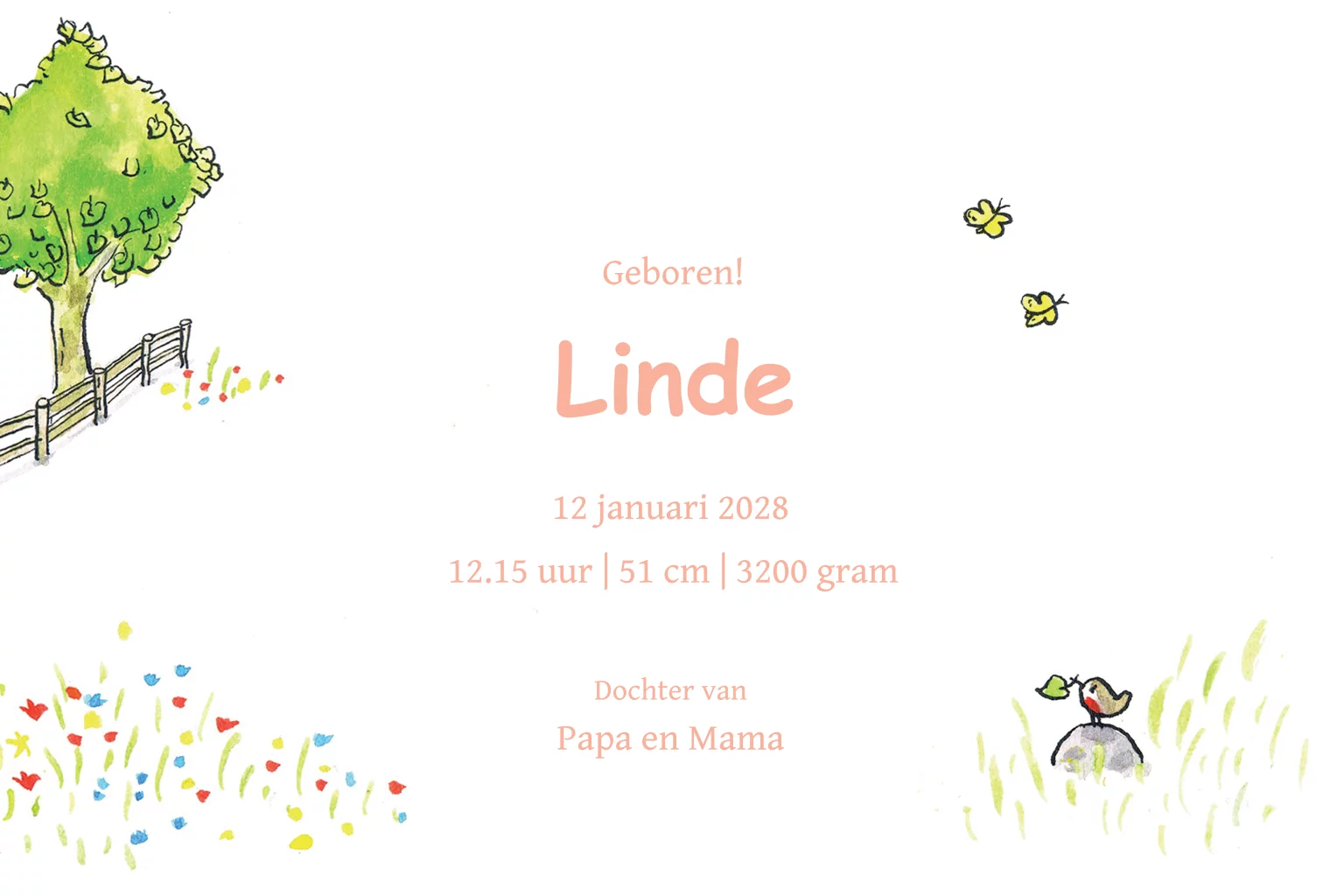Getekend geboortekaartje met bomen, schommel en katjes. Voor een meisje. (3662)