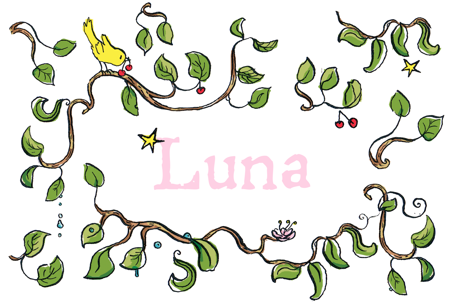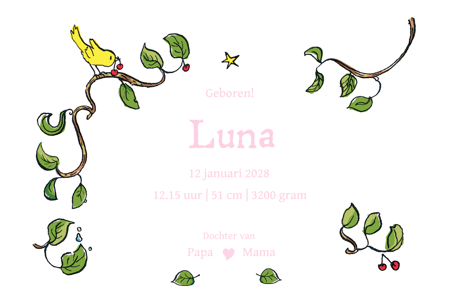 Lief getekend geboortekaartje met een vogel en takjes. Voor een meisje. (3660)