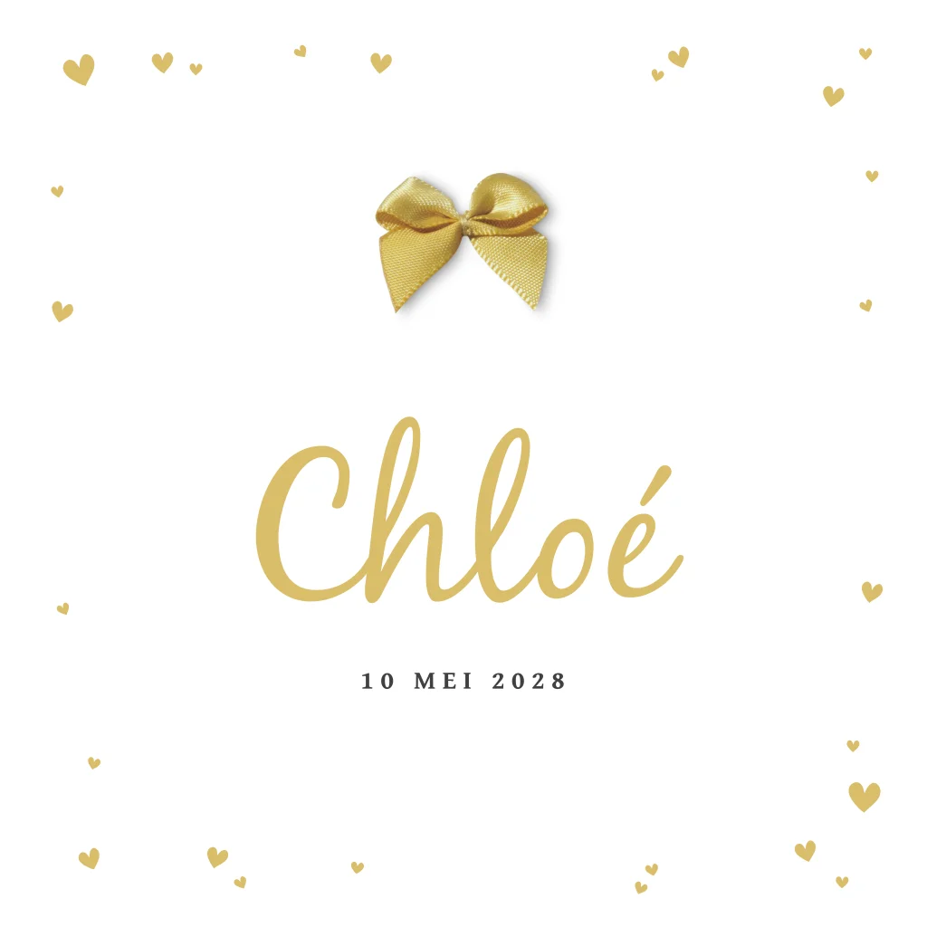 Hip geboortekaartje voor meisje met okergele hartjes en echt strikje