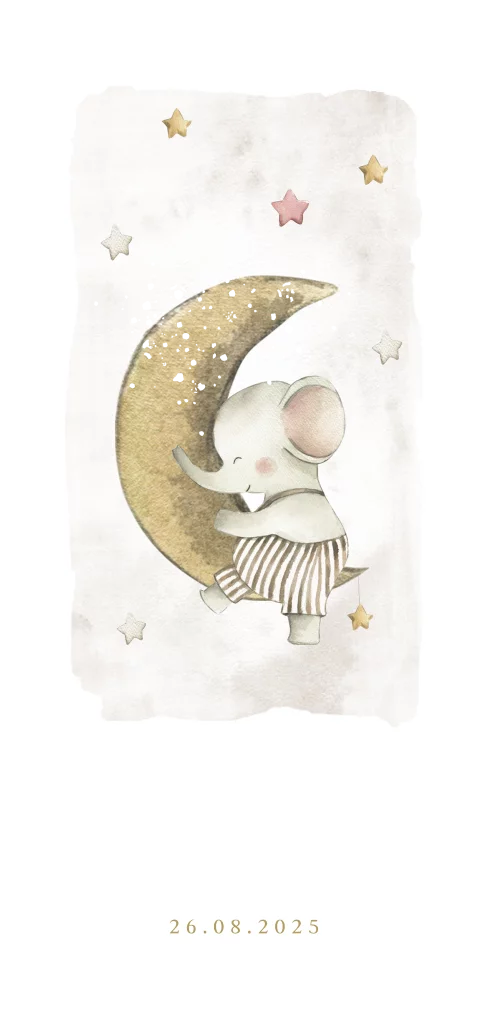 Lief geboortekaartje voor een meisje met sterren en een olifant op maan. (4687)