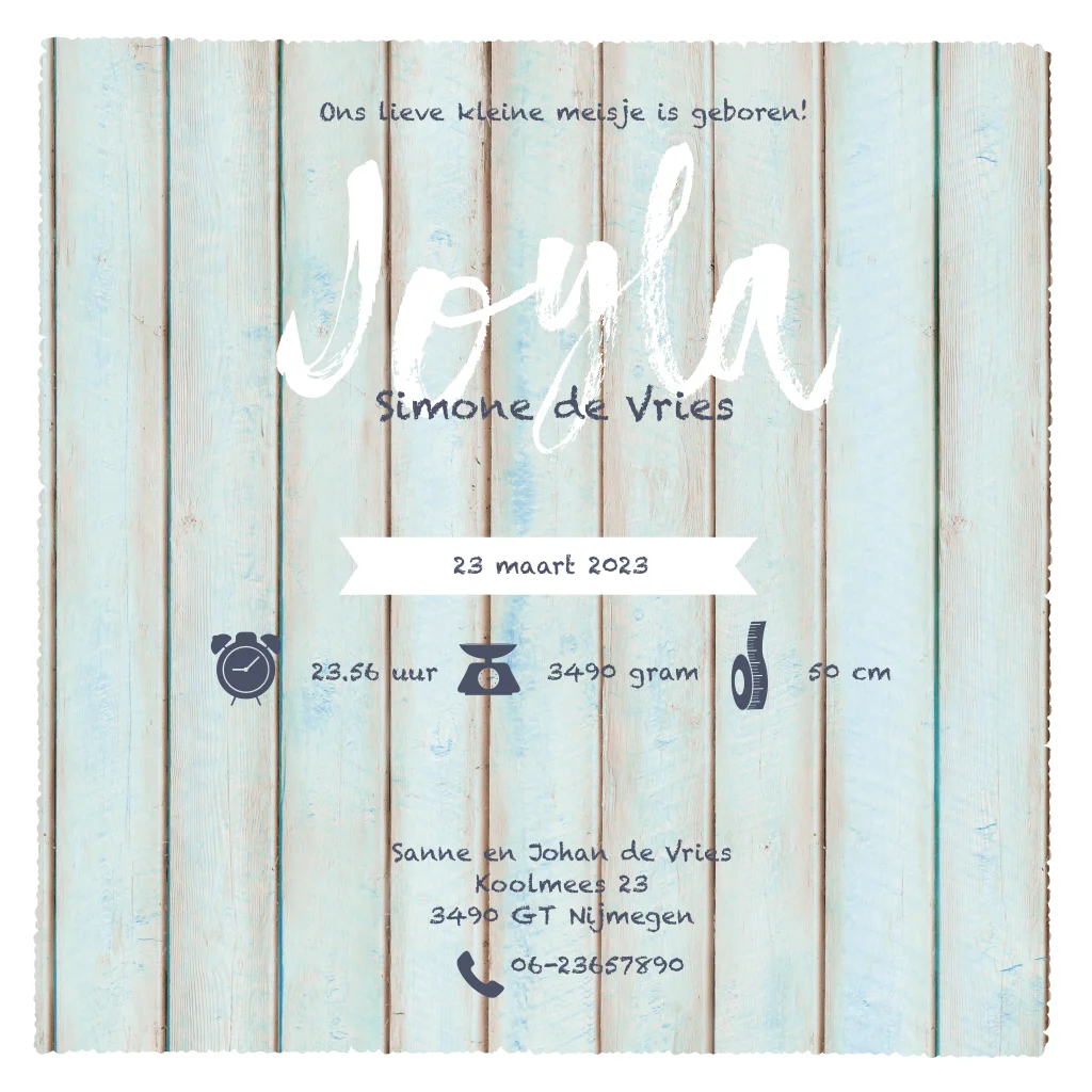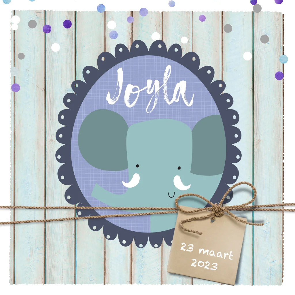 Geboortekaartje voor een meisje/jongen met olifantje met label en sloophout achtergrond. (185)