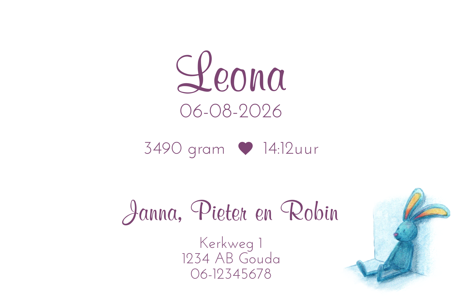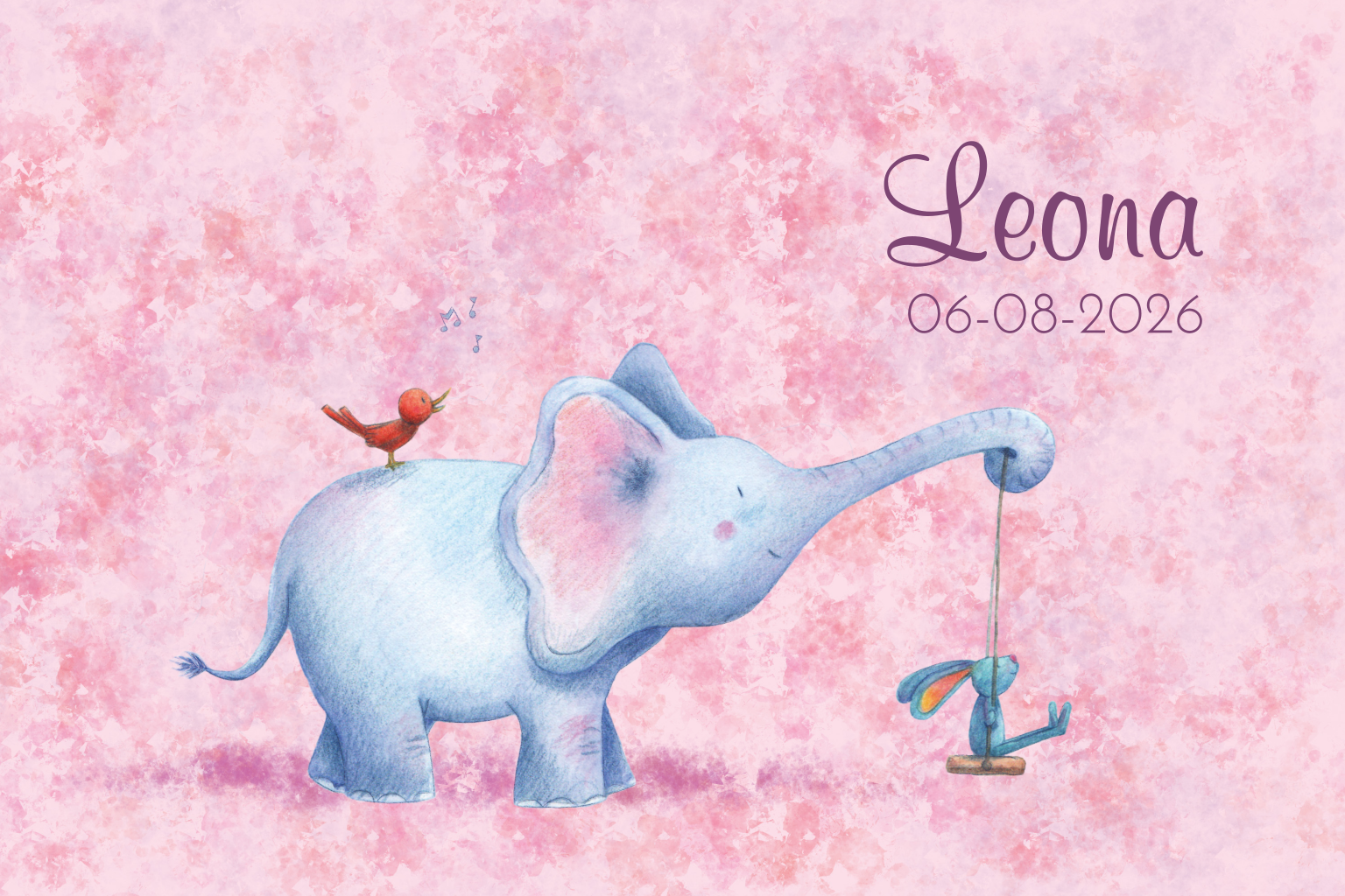 Vrolijk geboortekaartje voor een meisje met illustratie van een olifantje met een schommel. Op de schommel zit een konijn en op de rug van het olifantje zit een vogeltje te zingen. (4417)