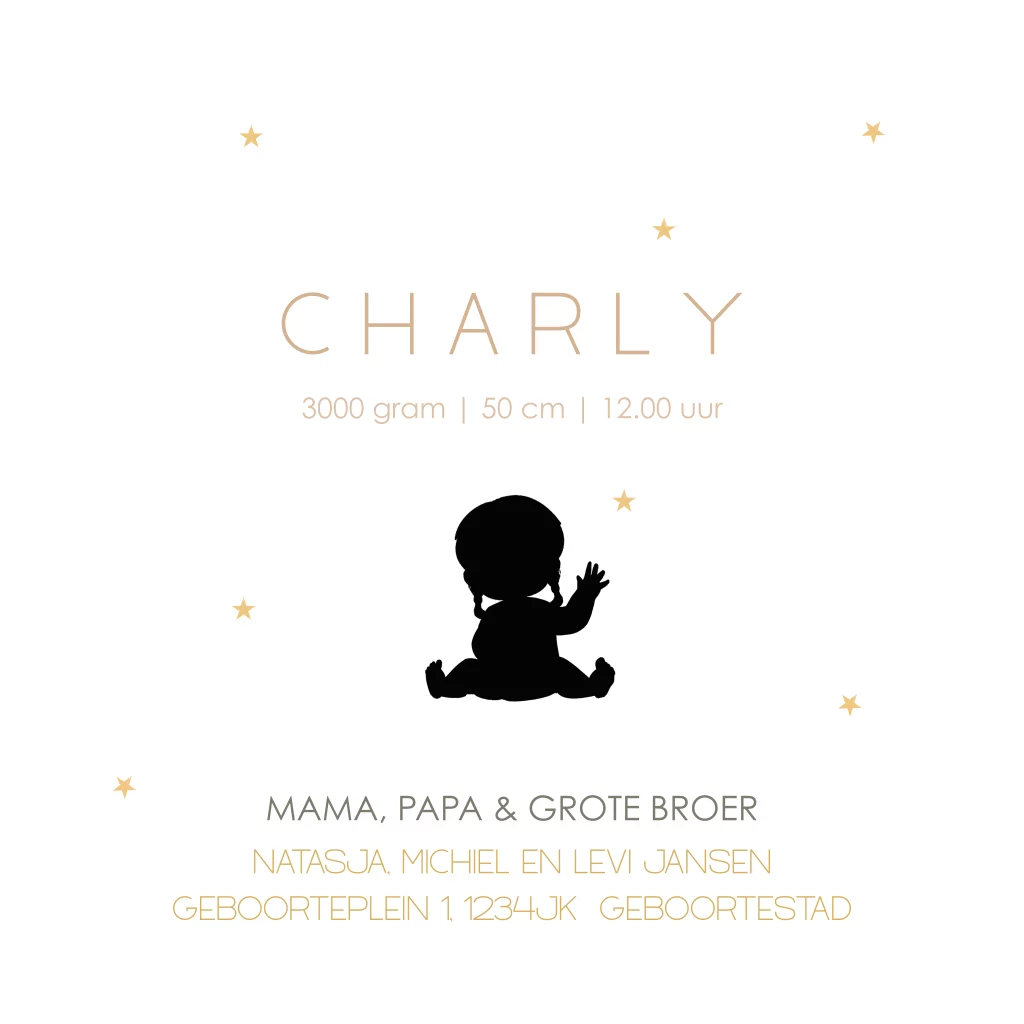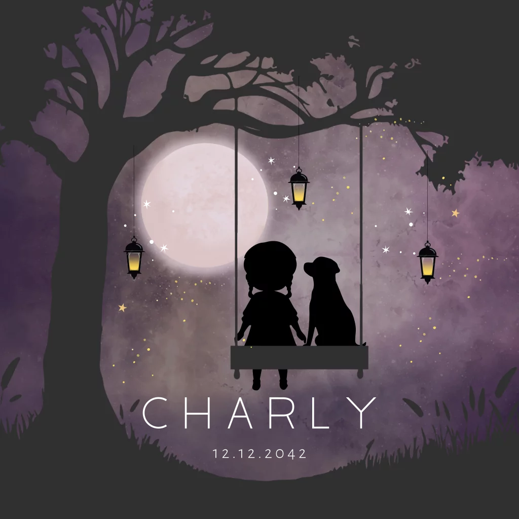 Geboortekaartje met een silhouet van een meisje met een hondje op een schommel. Met een maan en hartjes.