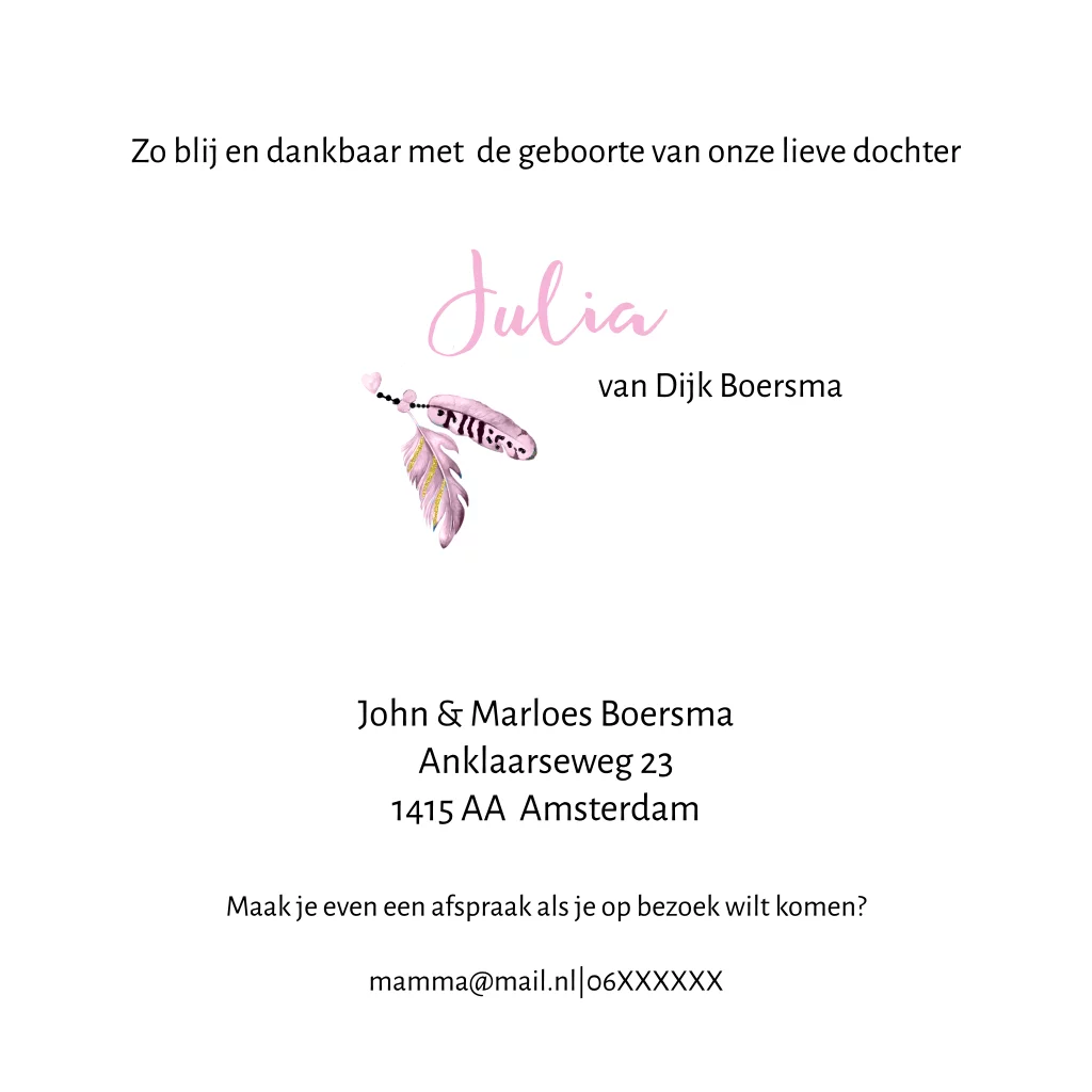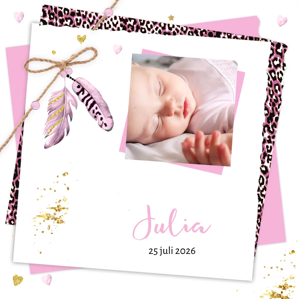 Geboortekaartje papiertjes met panterprint en veertjes voor een meisje. (3022)