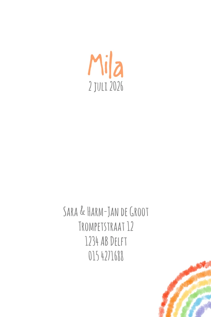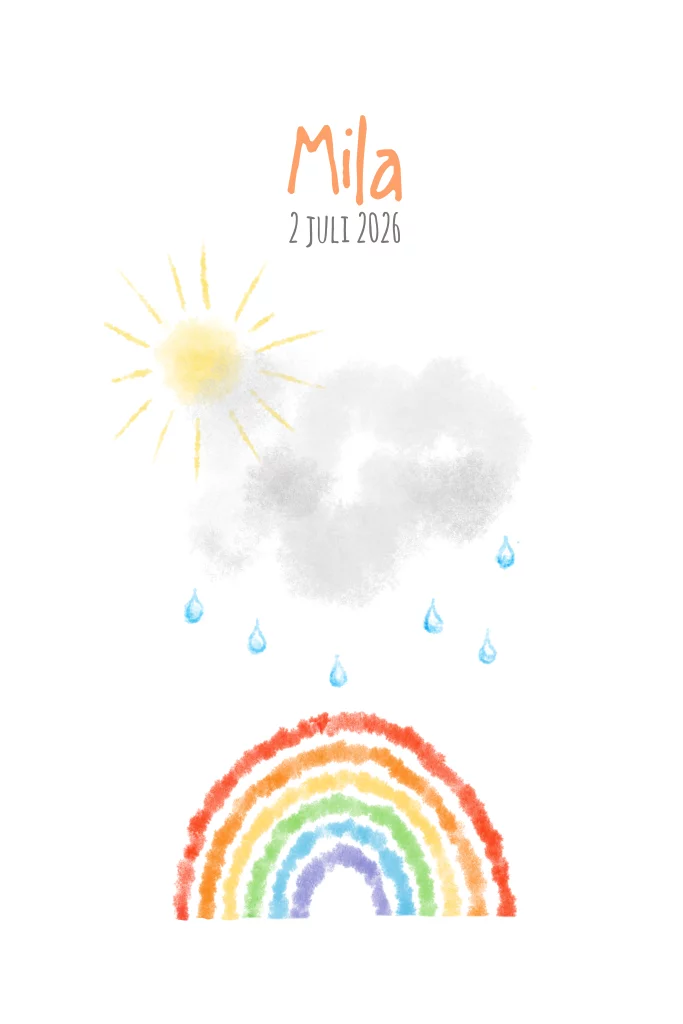 Een hip geboortekaartje voor een meisje met regenboog, wolk, zon en druppels in aquarel. (3265)