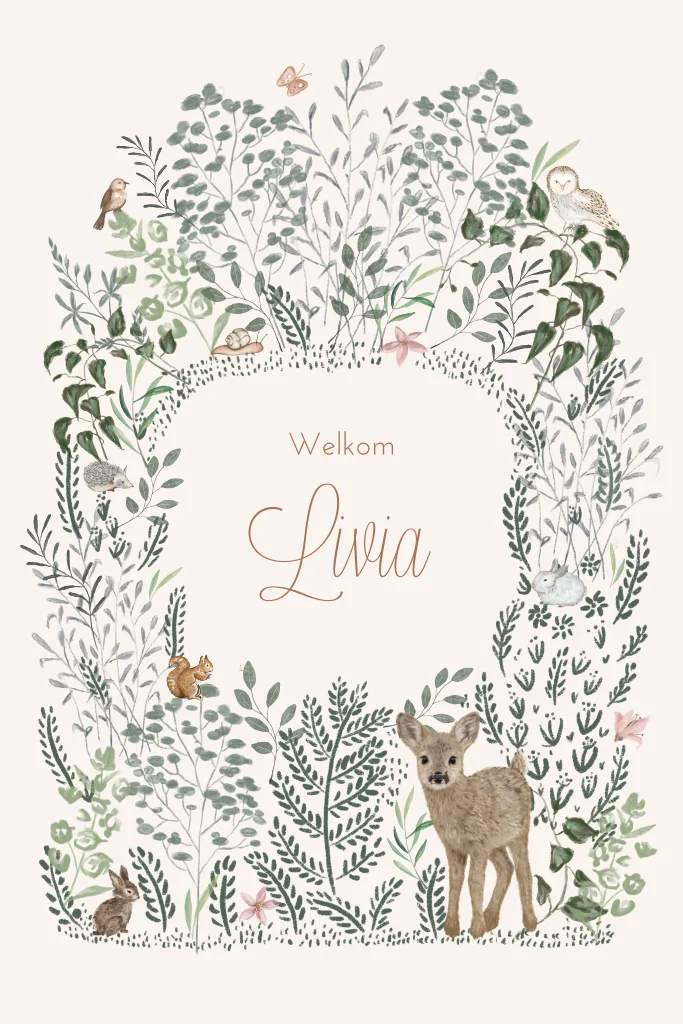Een lief geboortekaartje met geschilderde illustraties van verschillende bosdieren tussen groene plantjes en takjes. Een hertje, een konijntje en een slak, een uil , een egeltje en een vogeltje zitten verstopt tussen het groen. In het midden is er ruimte voor de naam van jullie dochtertje en de geboortedatum. Pas het ontwerp eenvoudig aan naar eigen wens in onze online editor.