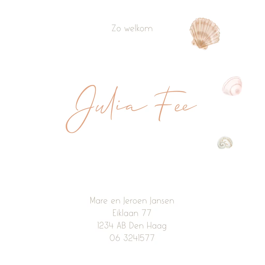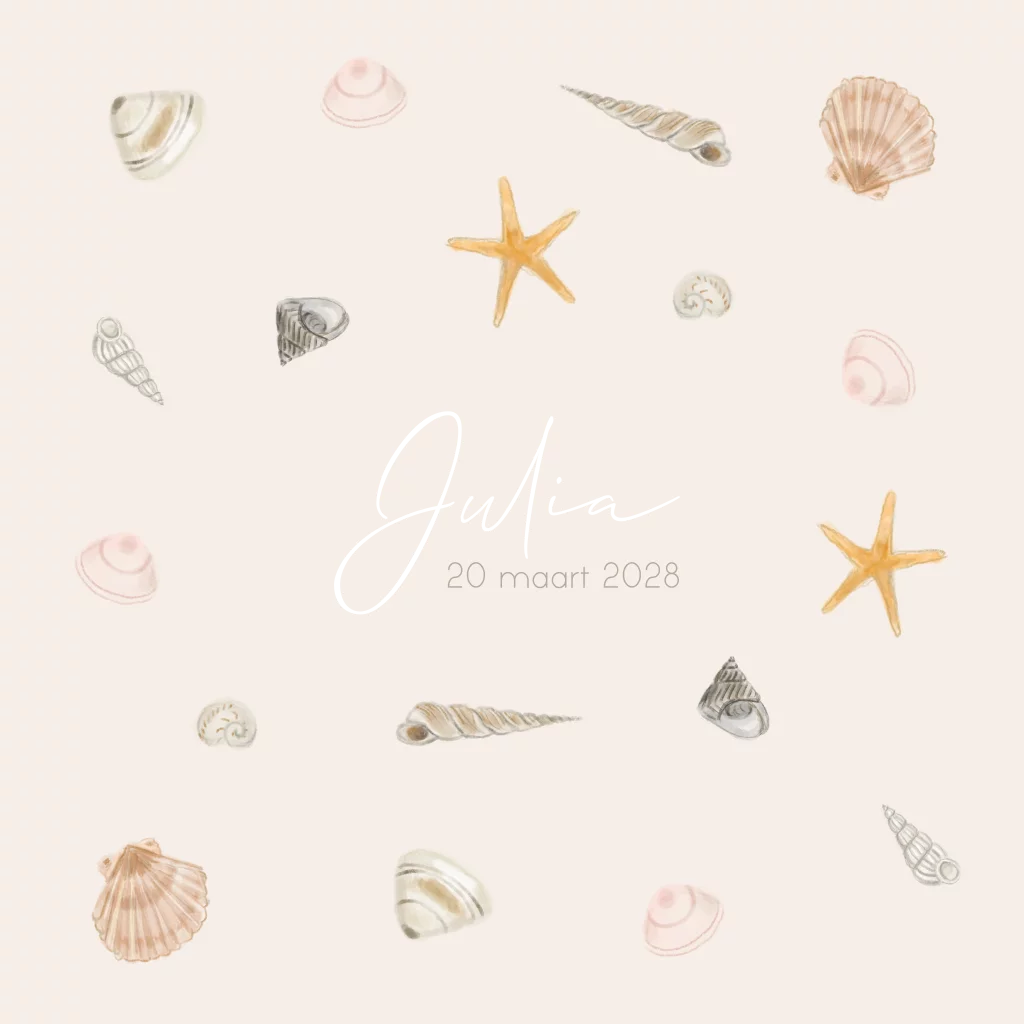 Een origineel verfijnd geboortekaartje met schelpen in zachte tinten. (4644)